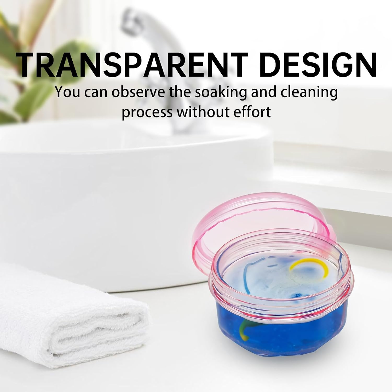 Denture Bath Case Denture Cleaning Cup with Lid Leak Proof, False Teeth Holder Mouthguard Storage Box Retainer Soaking Case for TravelHousehold|Office - Transparent Pink