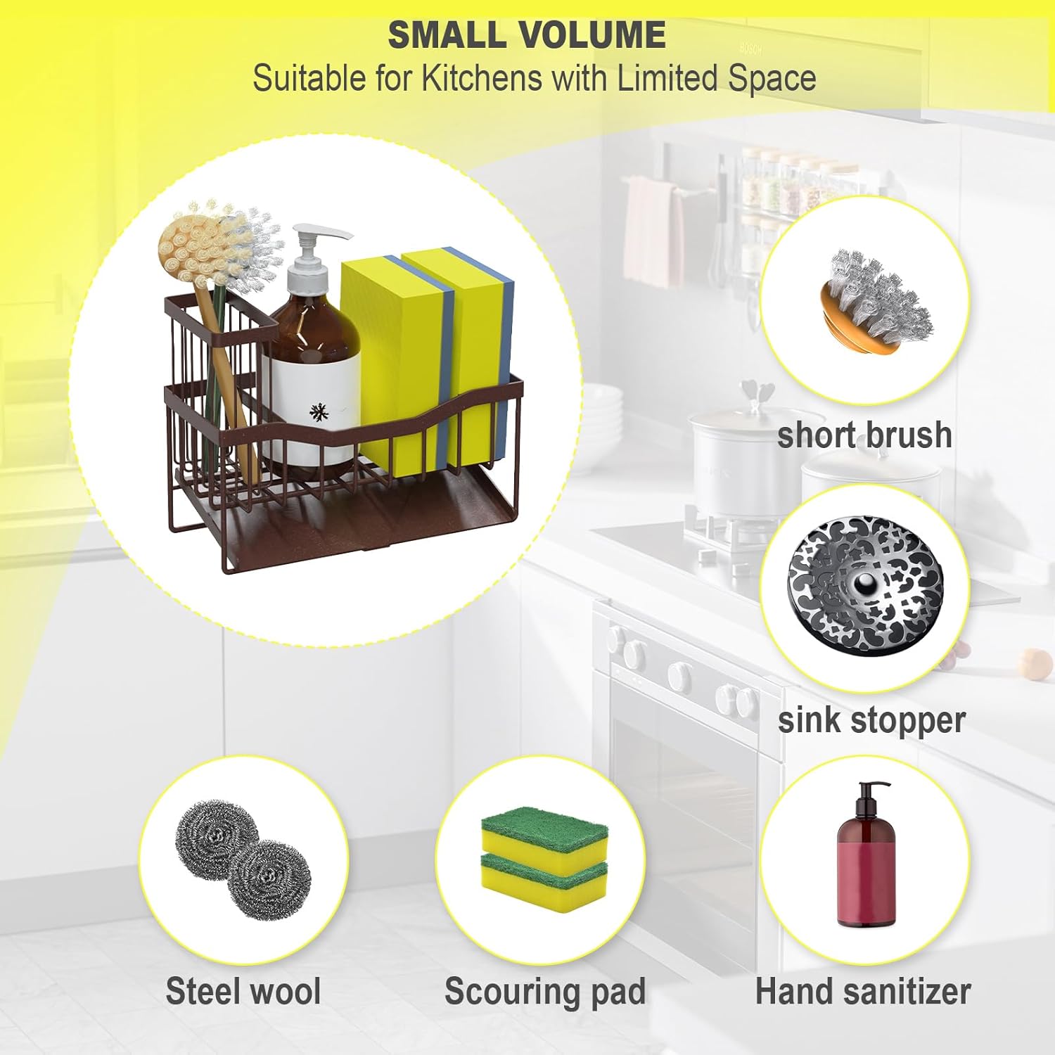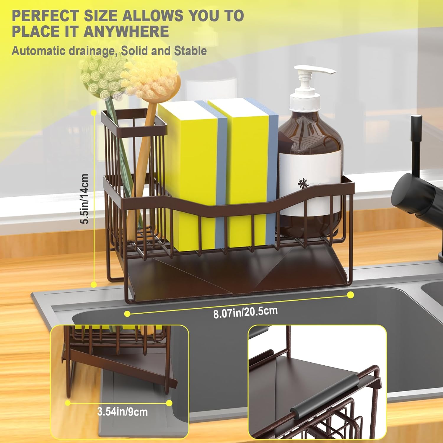 - 【Small Volume】Kitchen sink organizer is suitable for kitchens with limited space. It measures only 8.10"*3.60"*5.50"and can hold a detergent bottle, 2 sponge balls or sink stopper. It fits neatly on your countertop near the sink without taking up too much space and make your kitchen look cleaner.