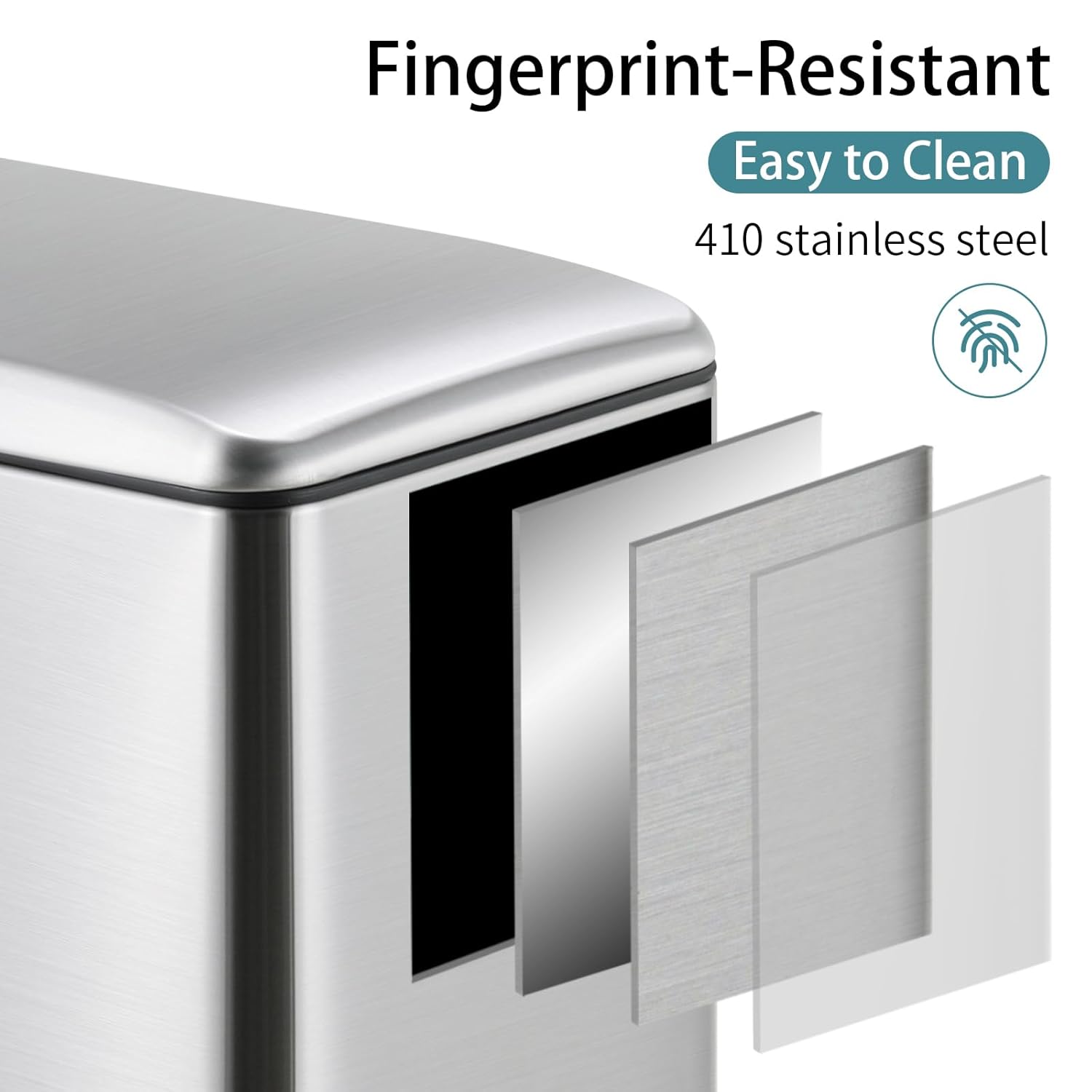 - 【Easy To Clean】 Kitchen garbage can is anti-fingerprint, anti-stain and easy to clean, you just need to wipe the surface of the trash cans with a damp cloth. Inner plastic bucket can be easily removed , it's convenient to empty trash and clean—just lift out, dispose, and wipe down for a fresh new trash can.