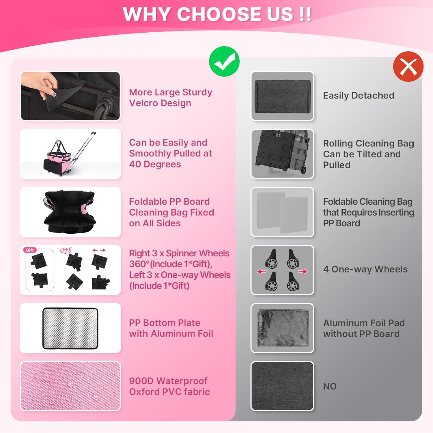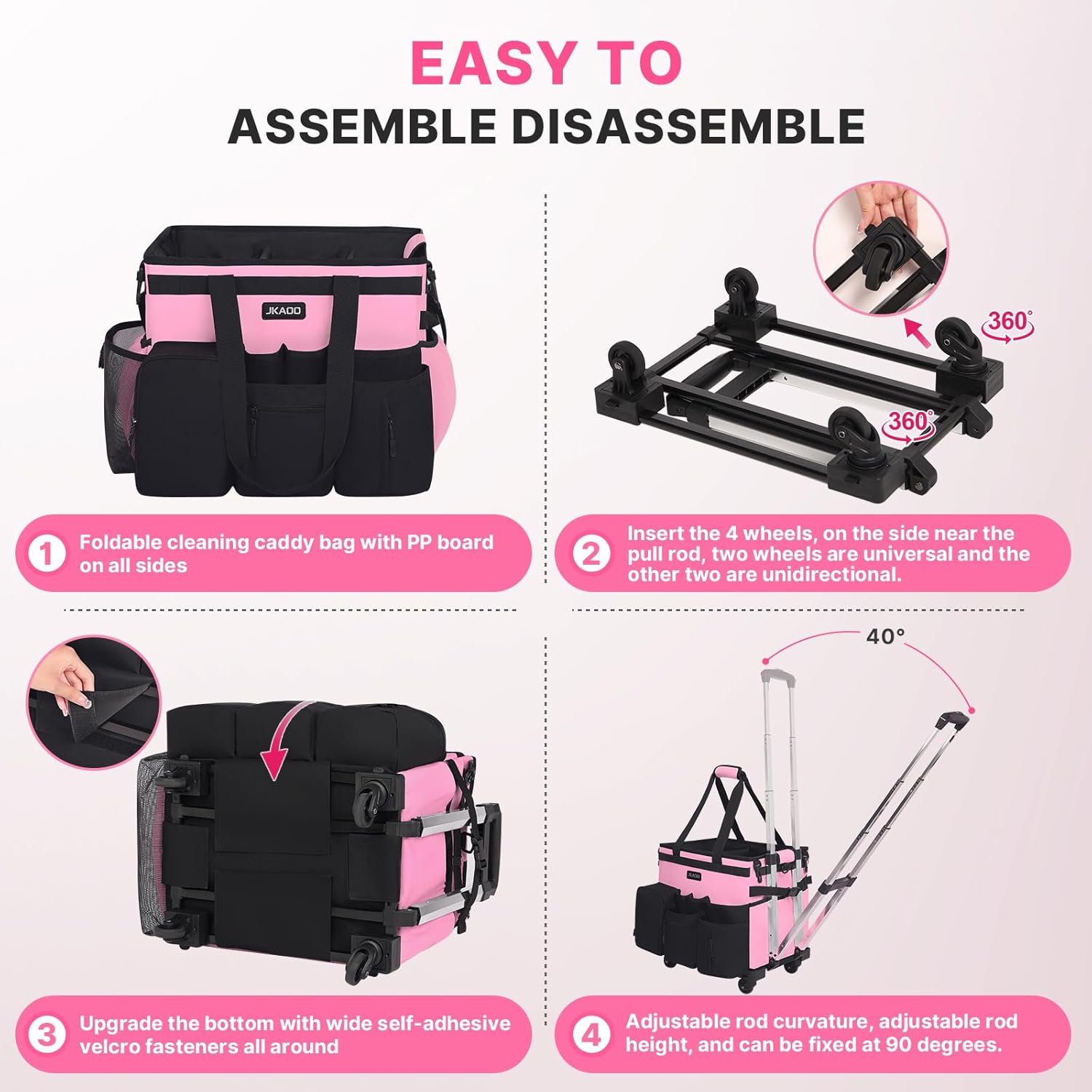 - 【90 °& 40 ° Adjustable Rolling Cleaning Caddy Bag】Rolling cleaning bag comes with 1 detachable shoulder strap and fixed double handles, both padded, it also comes with a detachable cart with 4 detachable inserted wheels (2 spinner wheels 360 °, 2 one-way wheels), and 2 extra wheels for later replacement. A 90 °& 40 ° adjustable pull bar is more agile than a traditional trolley and provides a more portable service