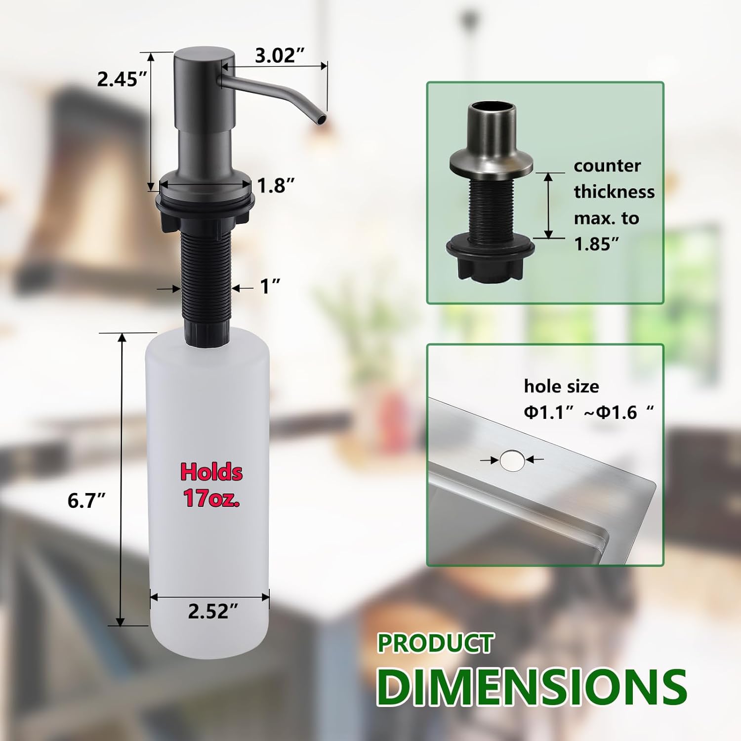 • 【Easy Installation】You can easily install this built-in soap dispenser on many kinds of kitchen sink or countertop with hole size between 1.1"-1.6", no require plumber. A detailed step-by-step installation instructions is included.