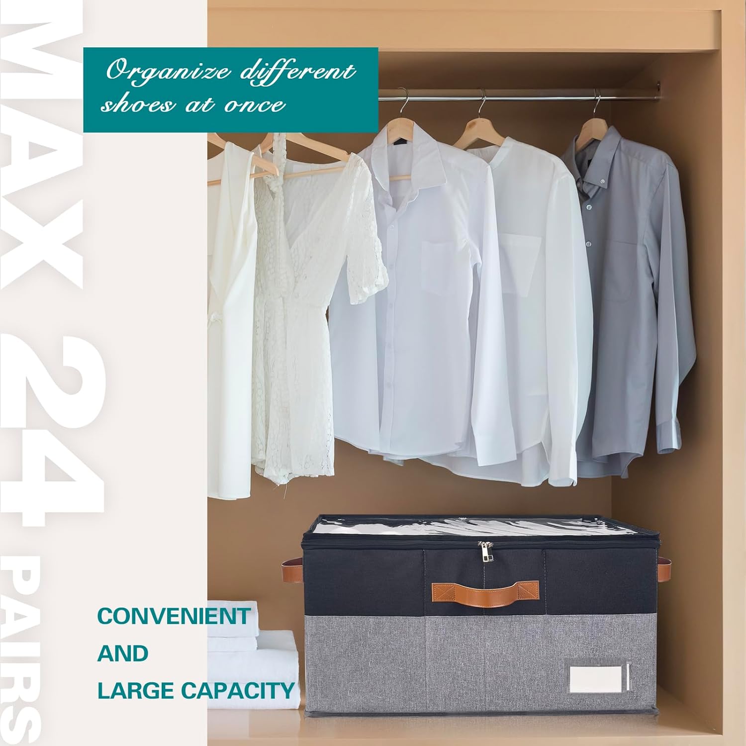 Shoe Organizer for Closet, Foldable Shoe Storage Bins with Clear Cover, Space Saving Shoes Holder with 4 Handles, Large Adjustable Shoe Box Storage Containers, Fits 12-24 Pairs, 1 Pack, Black