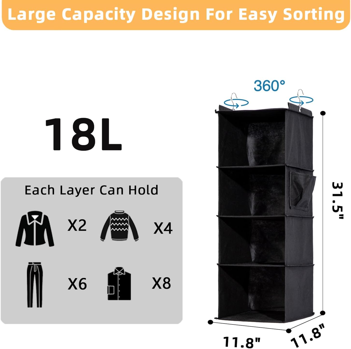 - 【Product Dimensions】This overall size is 11.8"(L)*11.8"(W)*31.5"(H). Each unit is 11.8"(L)*11.8"(W)*7.87"(H) . Before buying, it is recommended to measure the distance between your closet rod and the floor to see which model would be best for you.