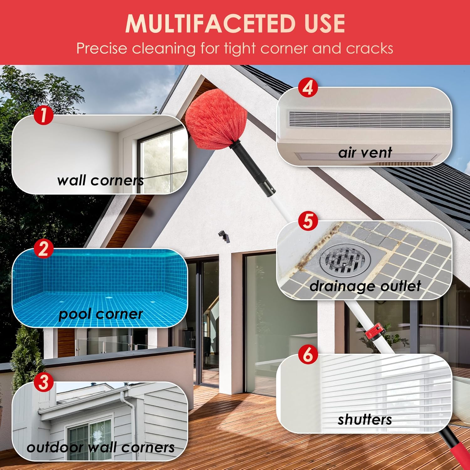 • Multi-Scenario Usage: Lightweight and easy-to-use cobweb duster with extension pole, perfect for cleaning high, hard-to-reach spots inside or outside; proper shape and soft bristles remove dust and cobweb to protect surfaces from scratches.