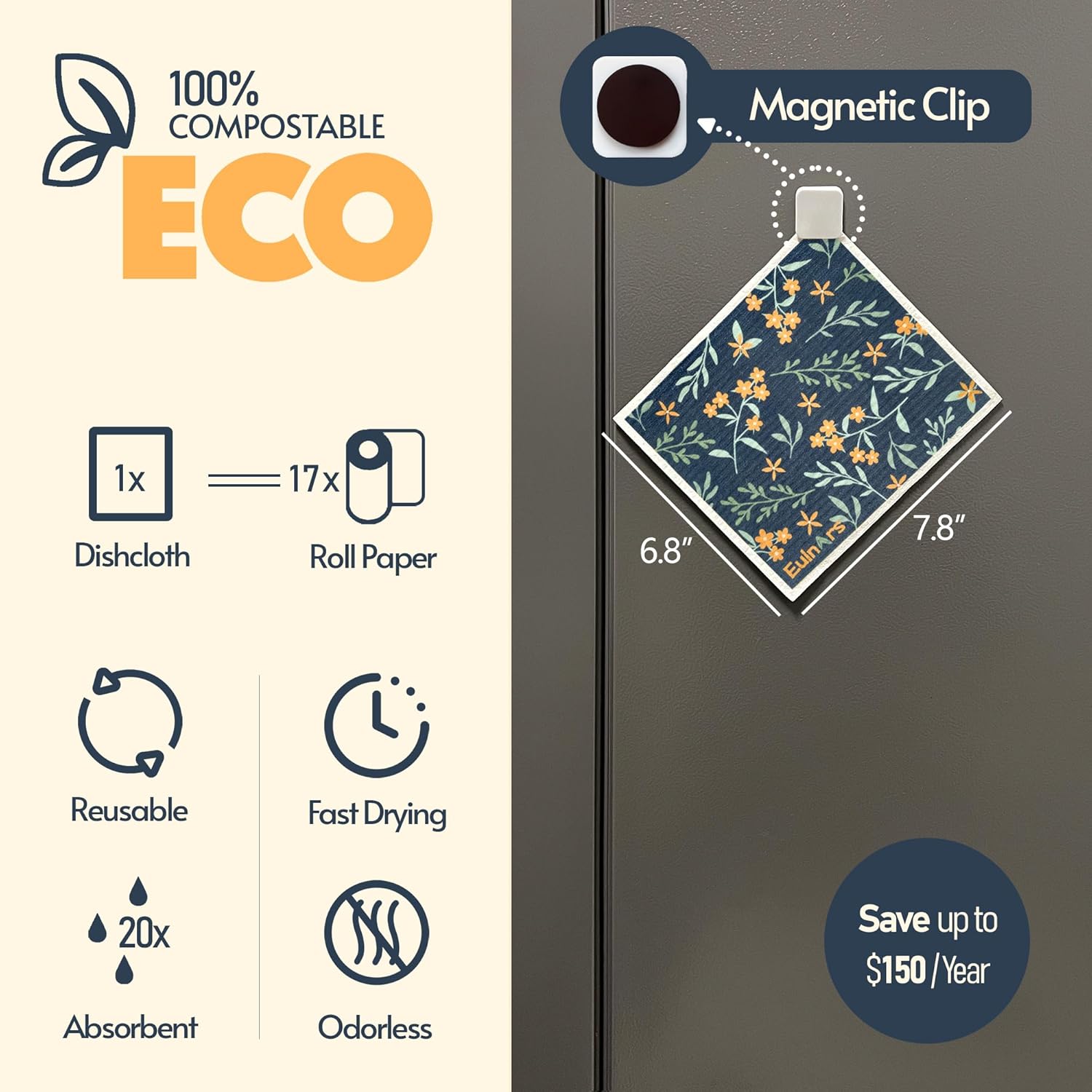 • Easy to Clean and Store: Our swedish dish cloths, measuring 7.8 x 6.8 inches, each set comes with 8 dish cloths in 4 styles, along with 2 self-adhesive clips, 1 magnetic clip, and 9 labeling tags. Customize storage for easy access, hanging them on walls, counters, or refrigerators to keep your kitchen organized