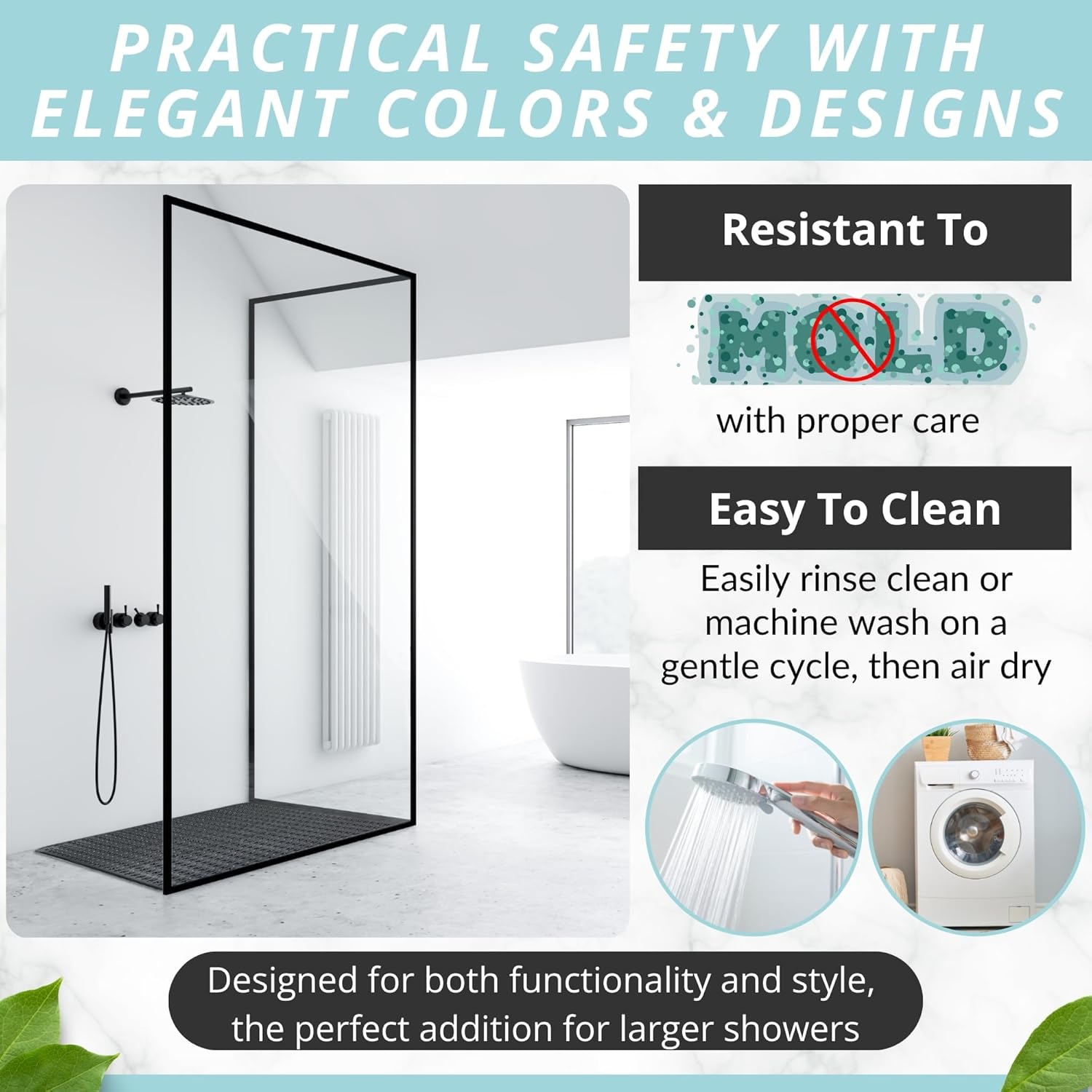 • EXTRA LARGE SIZE sized at 47 inch Length x 32 inch Width, our rectangle shower mat was designed for large shower stall floors for added coverage for more protection and safety. heavier and thicker than other mats, great for home, spa, gym bathroom, bath, and showers.