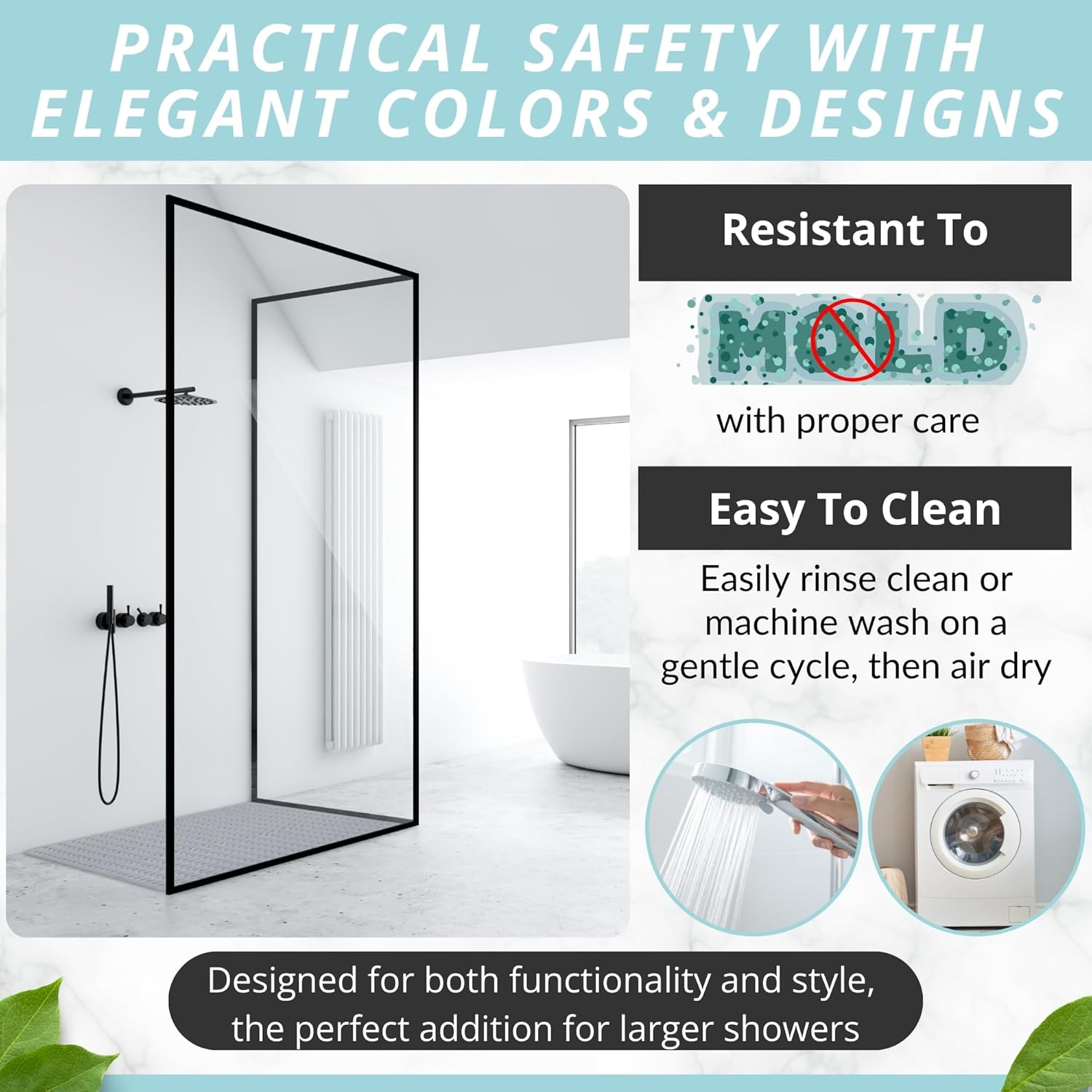• EXTRA LARGE SIZE sized at 47 inch Length x 32 inch Width, our rectangle shower mat was designed for large shower stall floors for added coverage for more protection and safety. heavier and thicker than other mats, great for home, spa, gym bathroom, bath, and showers.