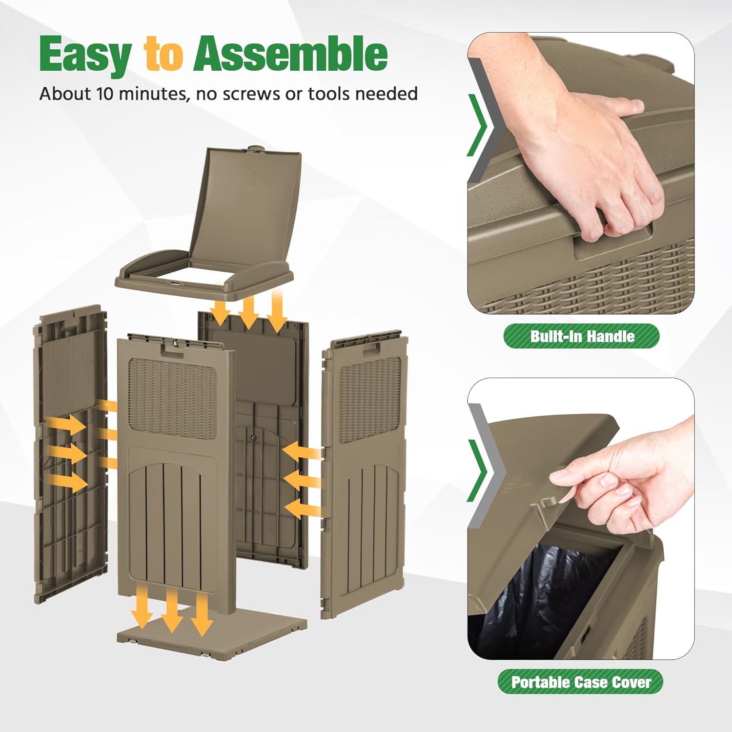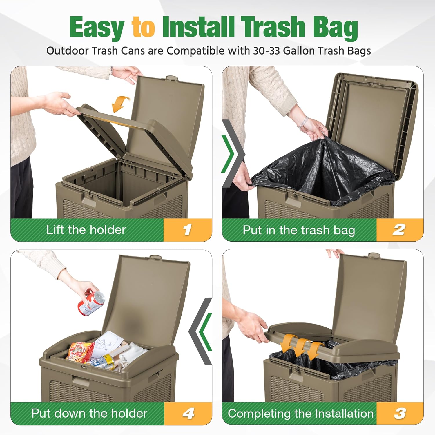 • Easy to Install Trash Bags: The waste bin for outdoors is compatible with 30-33 gallon trash bags. You need to lift the trash bag holder, put on the trash bag, put down the holder, and then finish the installation. After opening the inner lid, the garbage bag can be stably fixed in the card slot.