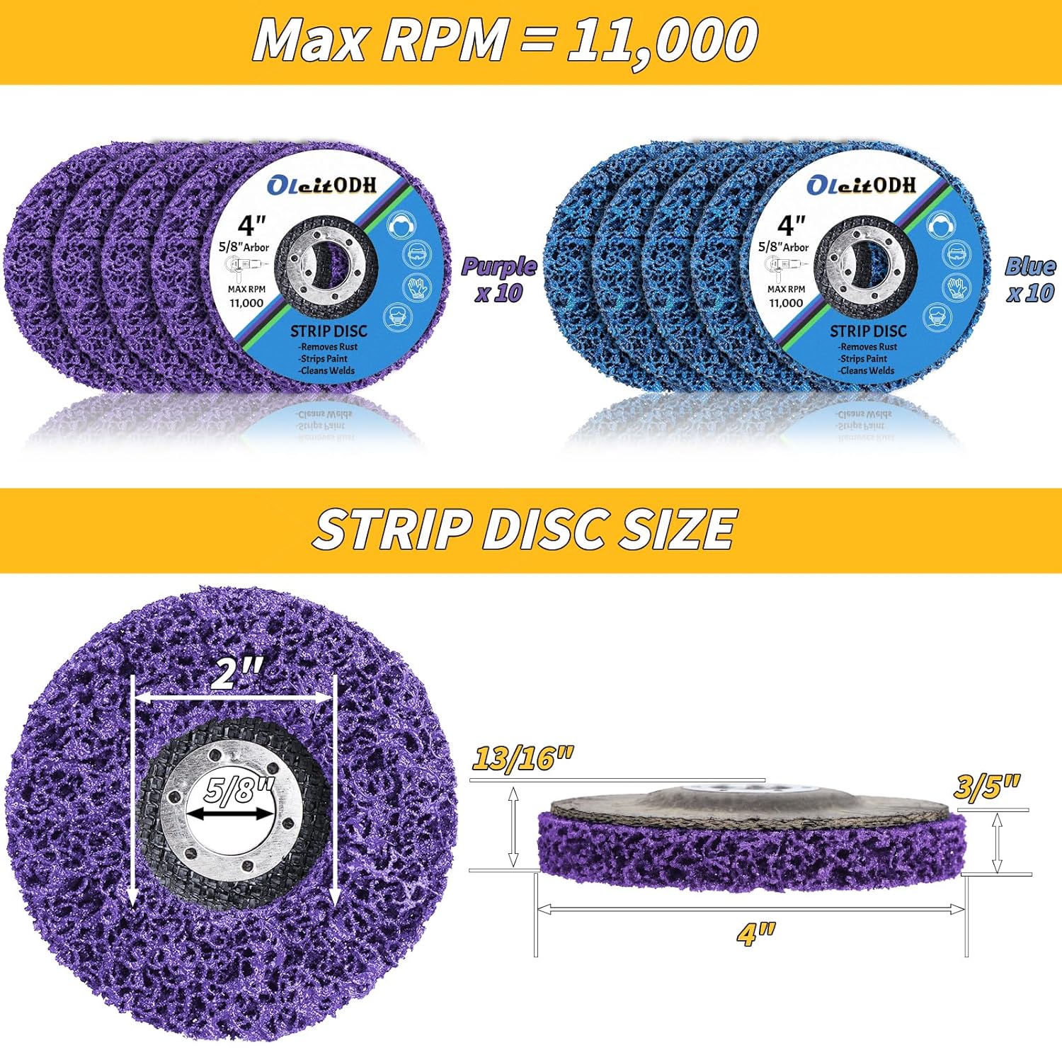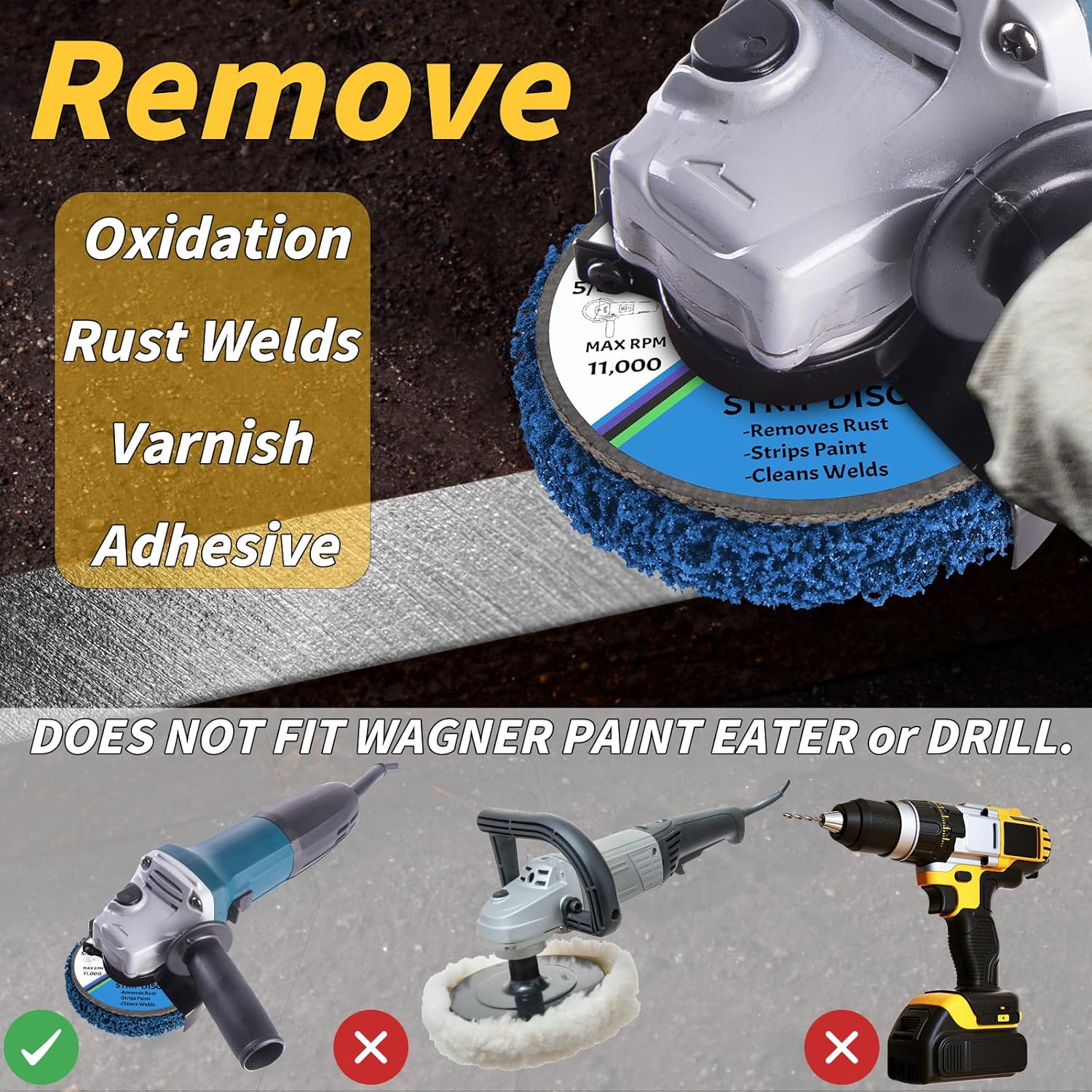 - 4" x 5/8" Strip Discs Bulk: The package includes 10x purple Paint Stripping Discand, 10x blue Paint Stripping Disc. our 4" x 5/8" strip discs effortlessly remove paint, rust, and oxidation, ensuring a smooth finish without damaging surfaces. Please be sure to wear a mask when using the strip disc to prevent inhalation of dust. We recommend that you wear gloves when using it