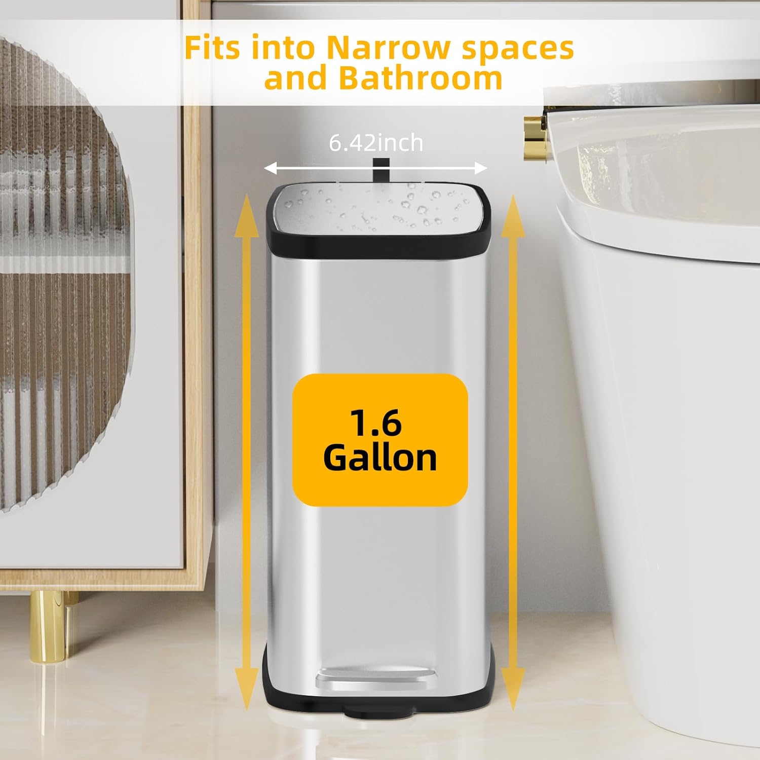 Stainless Steel Bathroom Trash Can with Lid Soft Close,1.6 Gallon Slim Garbage can,Small Metal Step Wastebasket for Office, Bedroom, Toilet, Live Room