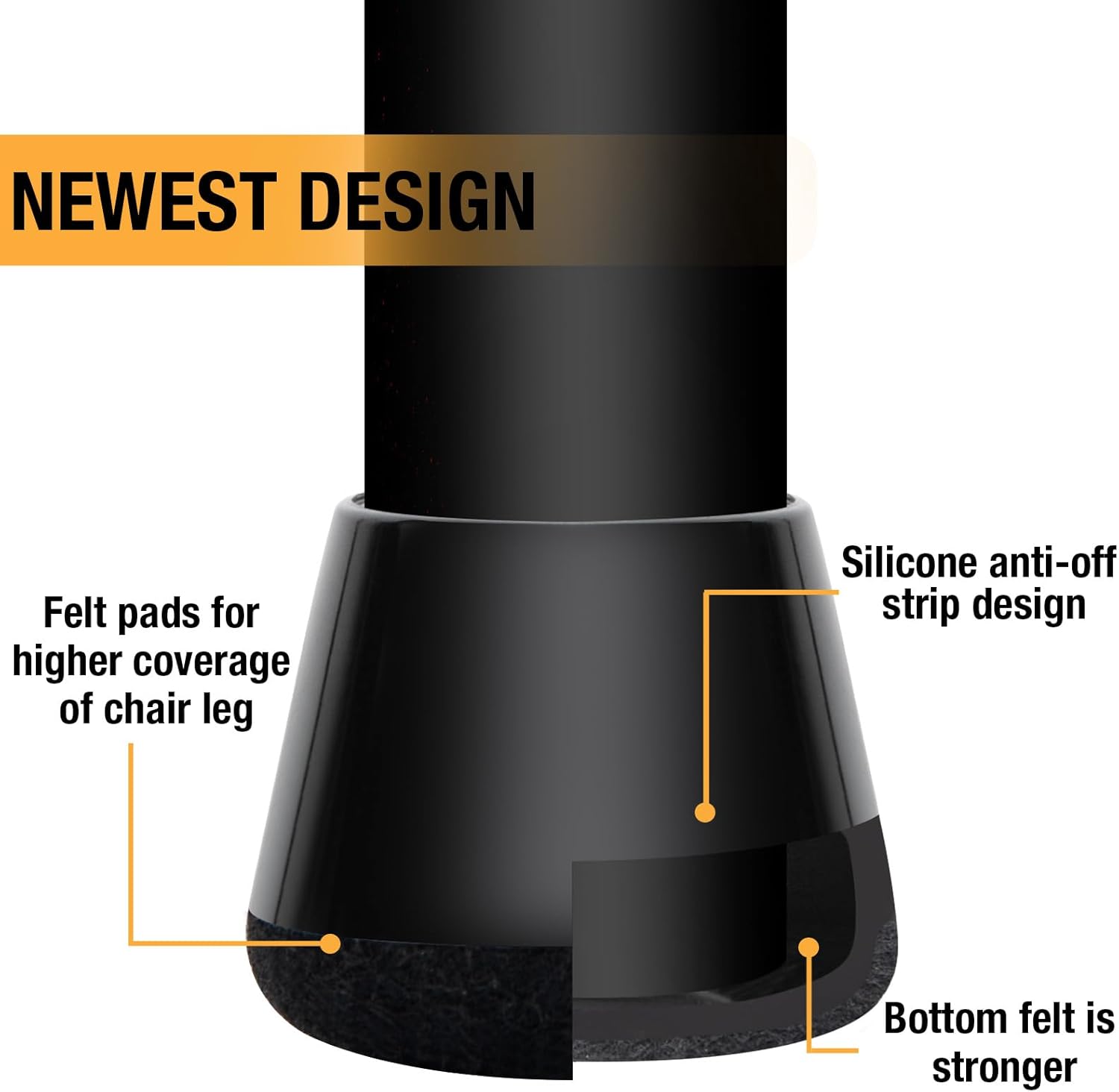 • 【Upgrade New Design】: 360° full felt pad bottom wrapped, which helps the felt bottom be able to touch the floor at any angle, preventing scratching the floor. Our chair leg floor protectors do not use gel. The bottom felt pad and the silicone chair leg floor protectors are integrated with a high-pressure machine to ensure that they will never fall off.