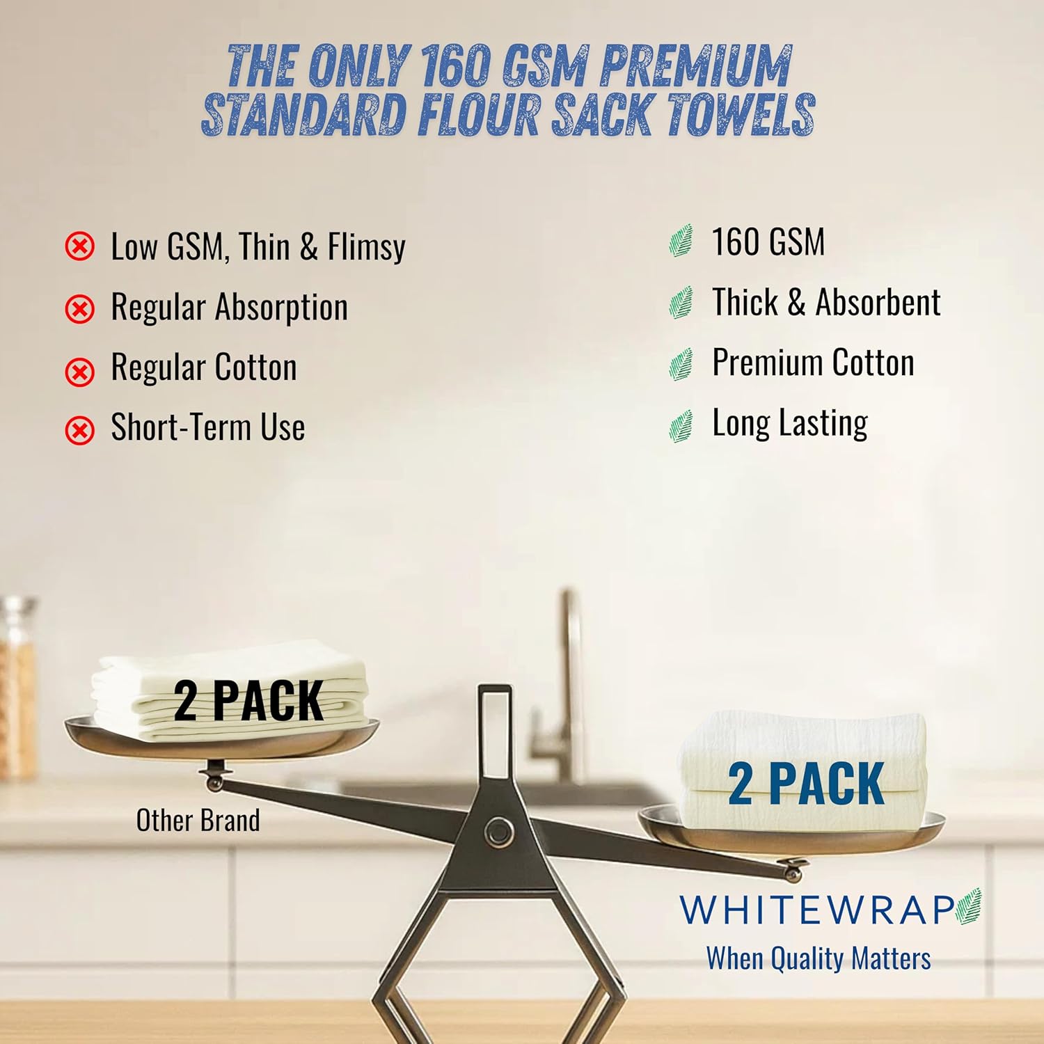 • ✅ Ultra-Thick 160 GSM Flour Sack Towels – Kitchen-Grade Absorbency Tired of thin, ineffective towels? WHITEWRAP’s high-density 160 GSM flour sack towels, made from 100% ring-spun cotton with a 130 thread count, offer exceptional thickness and ideal for drying dishes, wiping, and tough kitchen tasks.