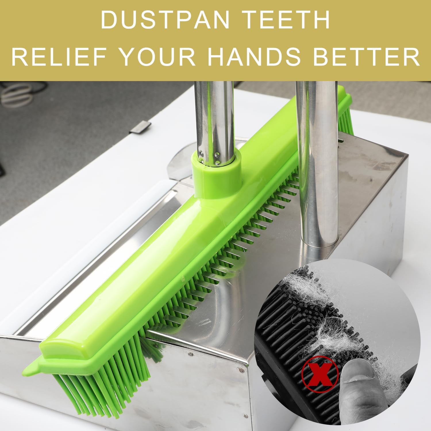 Rubber Broom and Dustpan Set,Pet Hair Removal Rubber Broom with Squeegee and Stainless Steel Dust Pan,Carpet Rake Push Broom and Dustpan for Fluff Hardwood Floor Tile (Green)