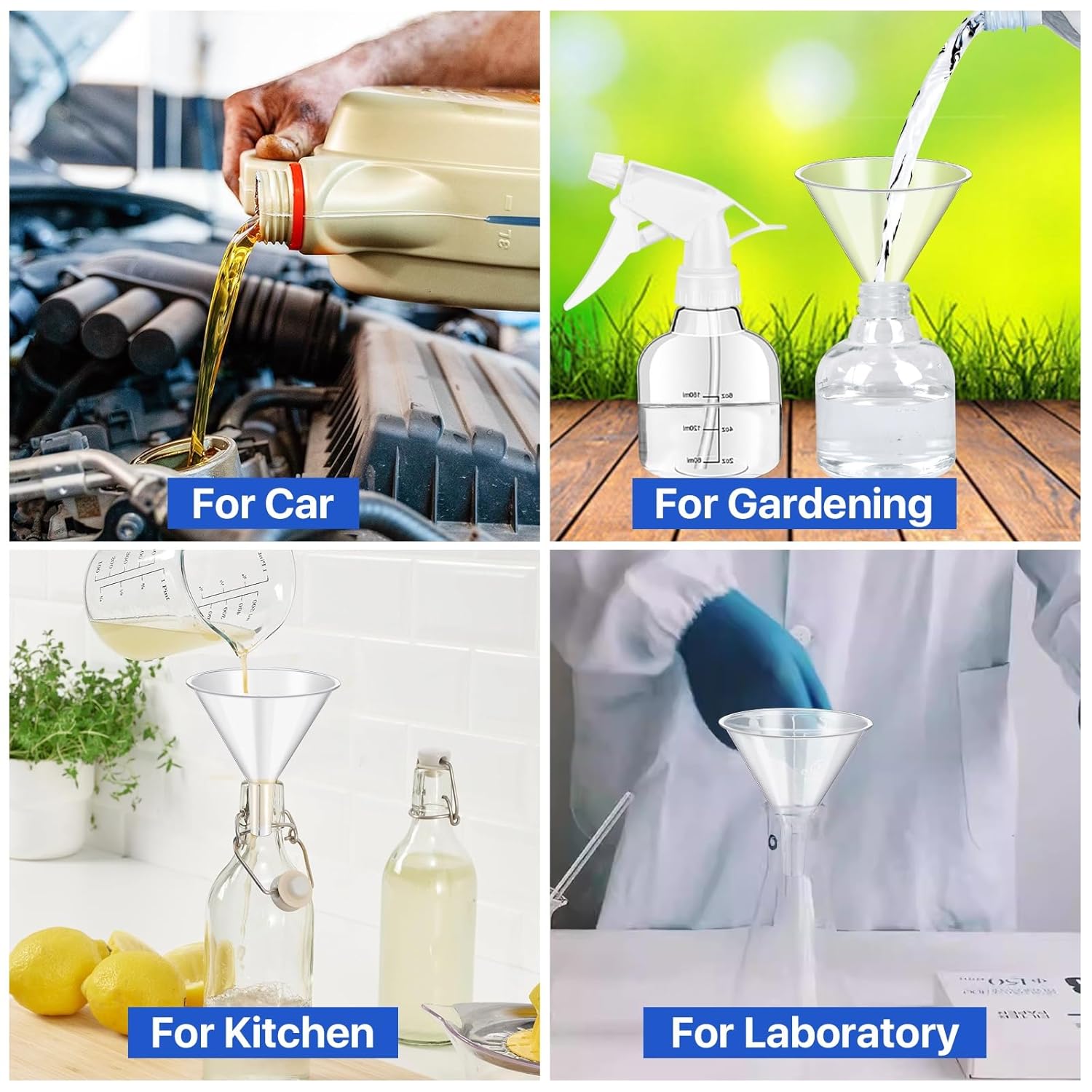 • WIDE APPLICATION - The funnels for filling bottles can be widely used for transferring water, juice, detergent, dry grits, perfumes, essential oils, sand paint, lotions, spices; perfect for home, kitchen, travel, studio, school and lab use