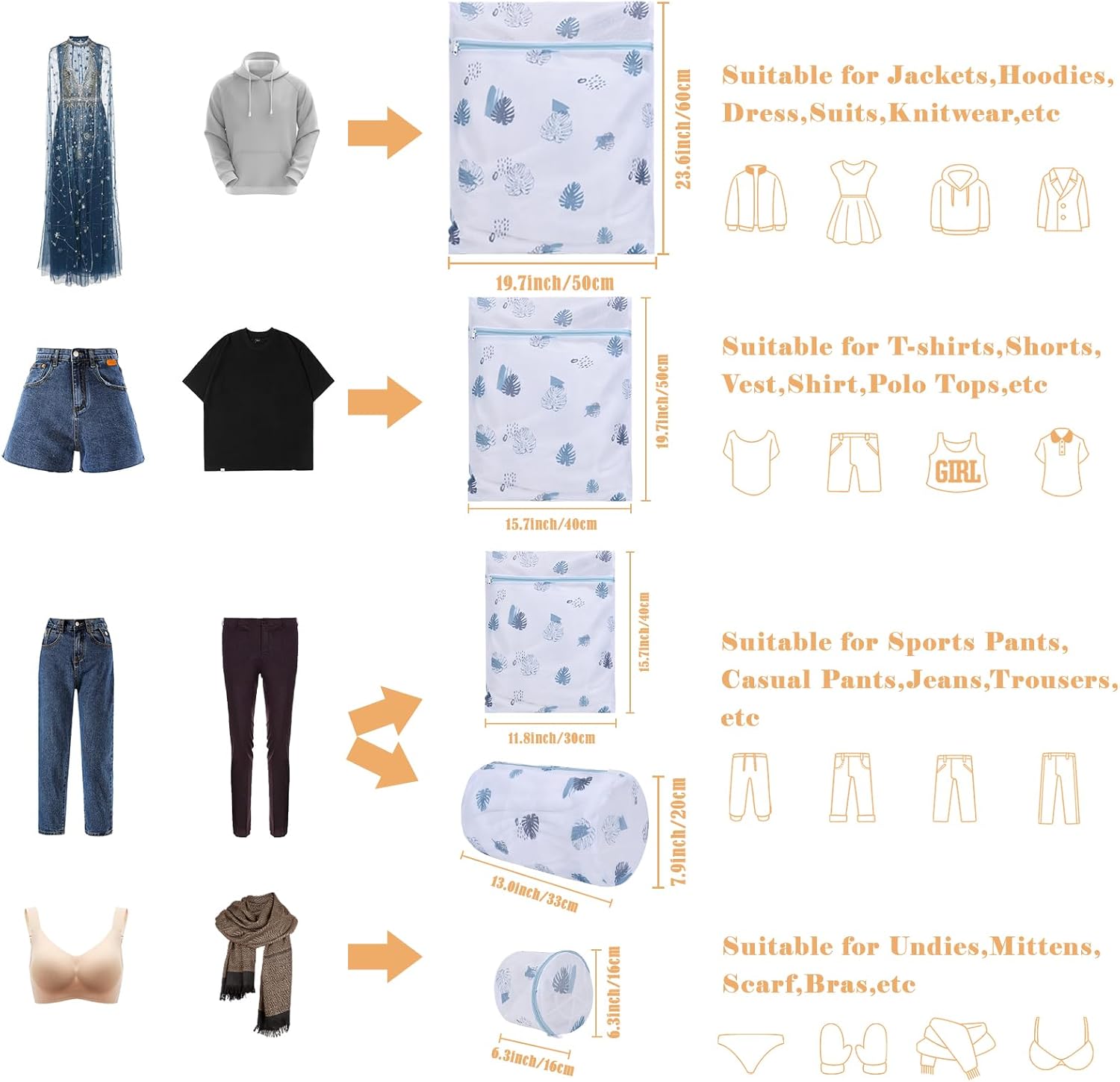• 5 Different Size: 1 Extra Large Size 24"x 20",1 Large Size 20"x 16", 1 Medium Size 16"x 12", 1 Bra Bag6"x 6", 1 Large Round Bag 8.6"x 13"; The wash bags can meet most families’ demand