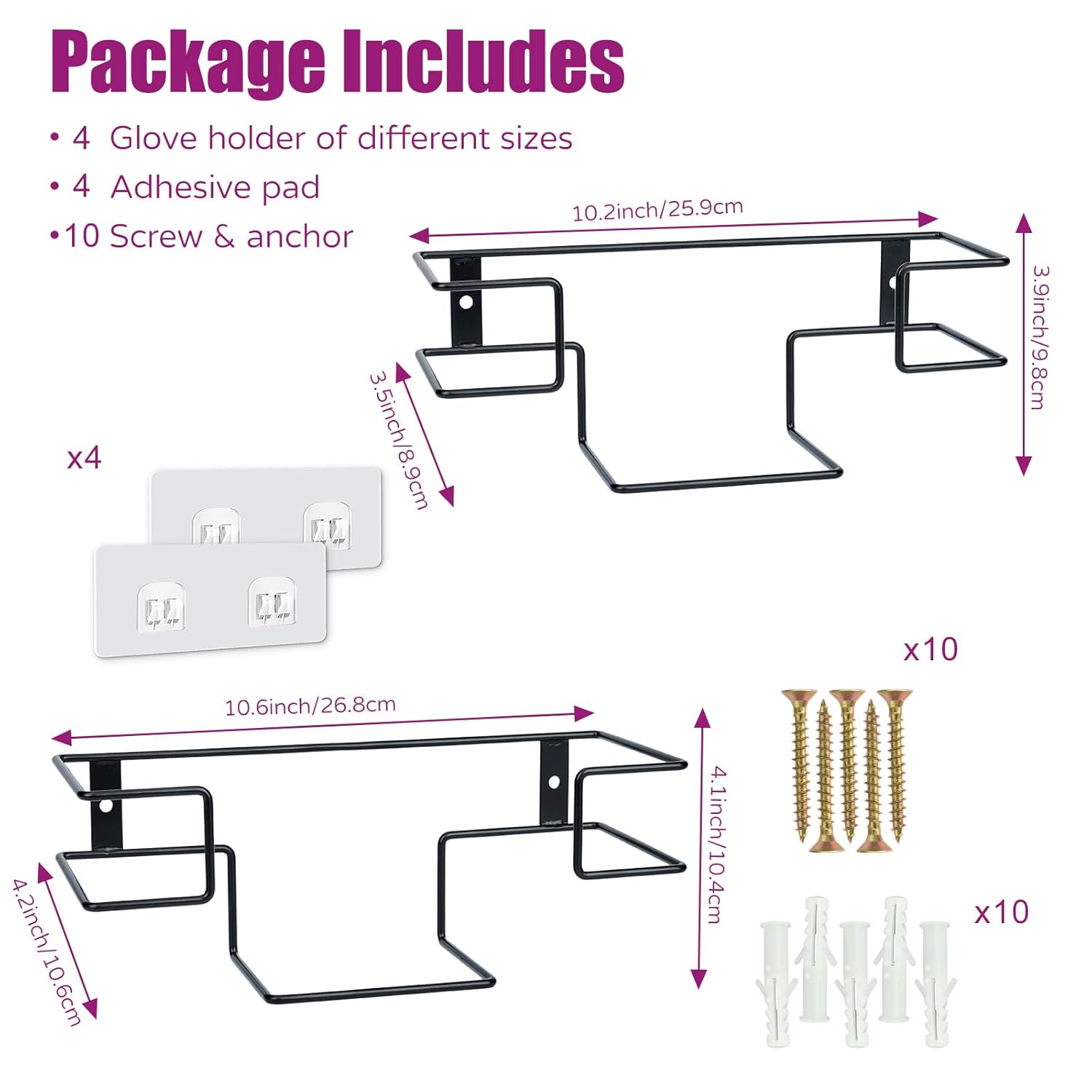 • What Will You Receive:4 glove holders, one large and one small in size. 4 adhesive pads, 10 screws and anchors. The large one can hold boxes measuring 10.28"L*3.78"W or smaller, and the small one can hold 9.8"L*3.1"W or smaller.
