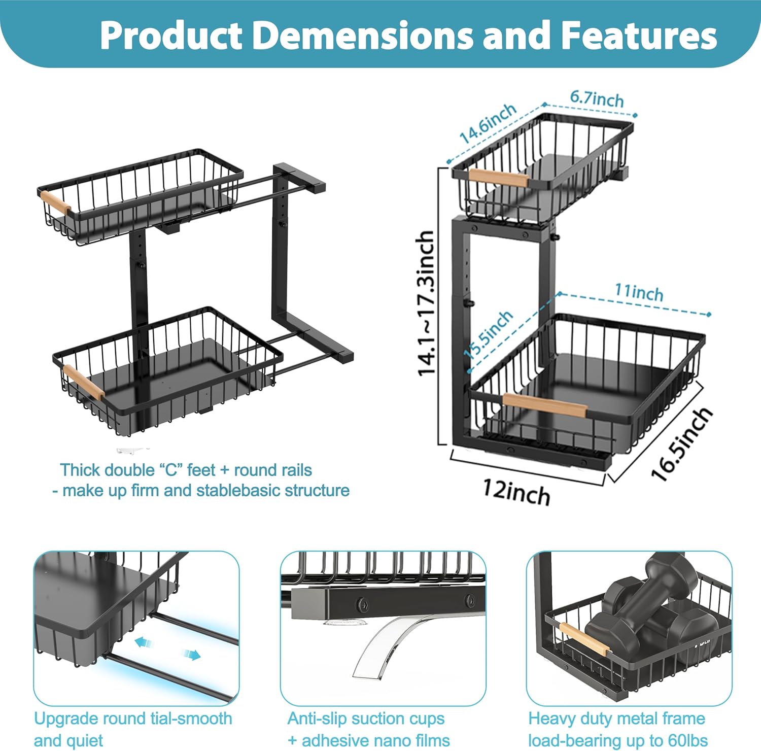 • 2 Tier Pull Out Baskets: Liuoud under sink shelves adopt upgraded round rails that slides out smoothly without jams or noise. Both Upper and lower drawers can slide out, which is perfect for accessing items deep in lower cabinet