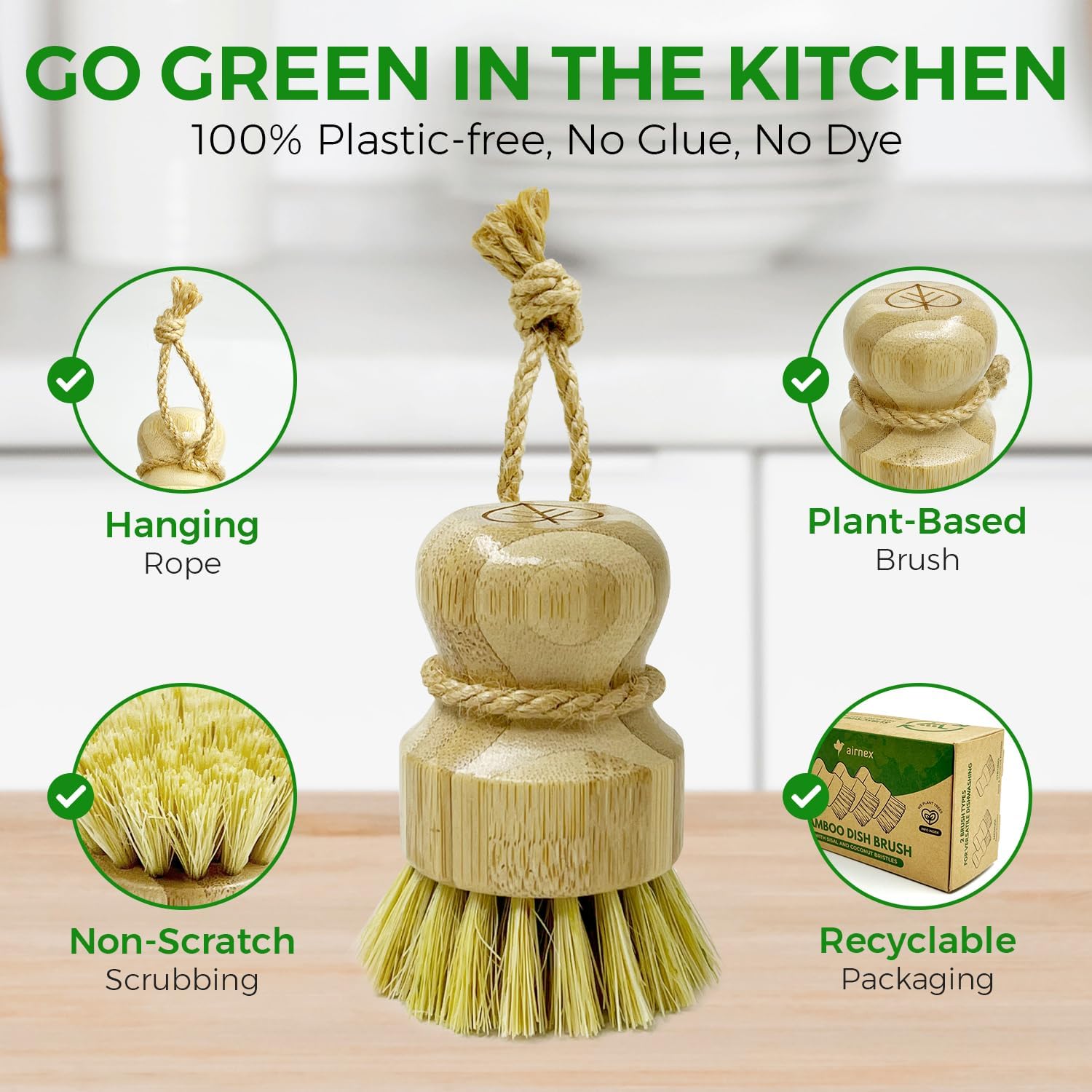 • NATURAL BAMBOO BRUSH FOR DISHES - Make an eco-conscious choice with an AIRNEX wooden brush for dishes. Its sturdy bamboo head & high-density sisal and coconut bristles can outlast regular kitchen brushes for cleaning, without getting stinky.
