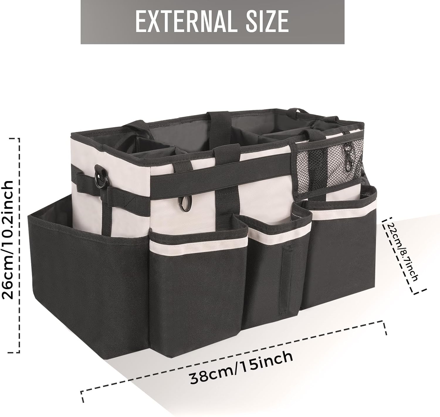 - Exquisite Details: The 5 inner compartments are large enough for organizing cleaning tools. 3 individual deep outer pockets, 1 mesh side pocket and 1 trash bag dispenser allow you storage and access of other cleaning tools. Also, securely zipped pocket is design for safely storing your important items