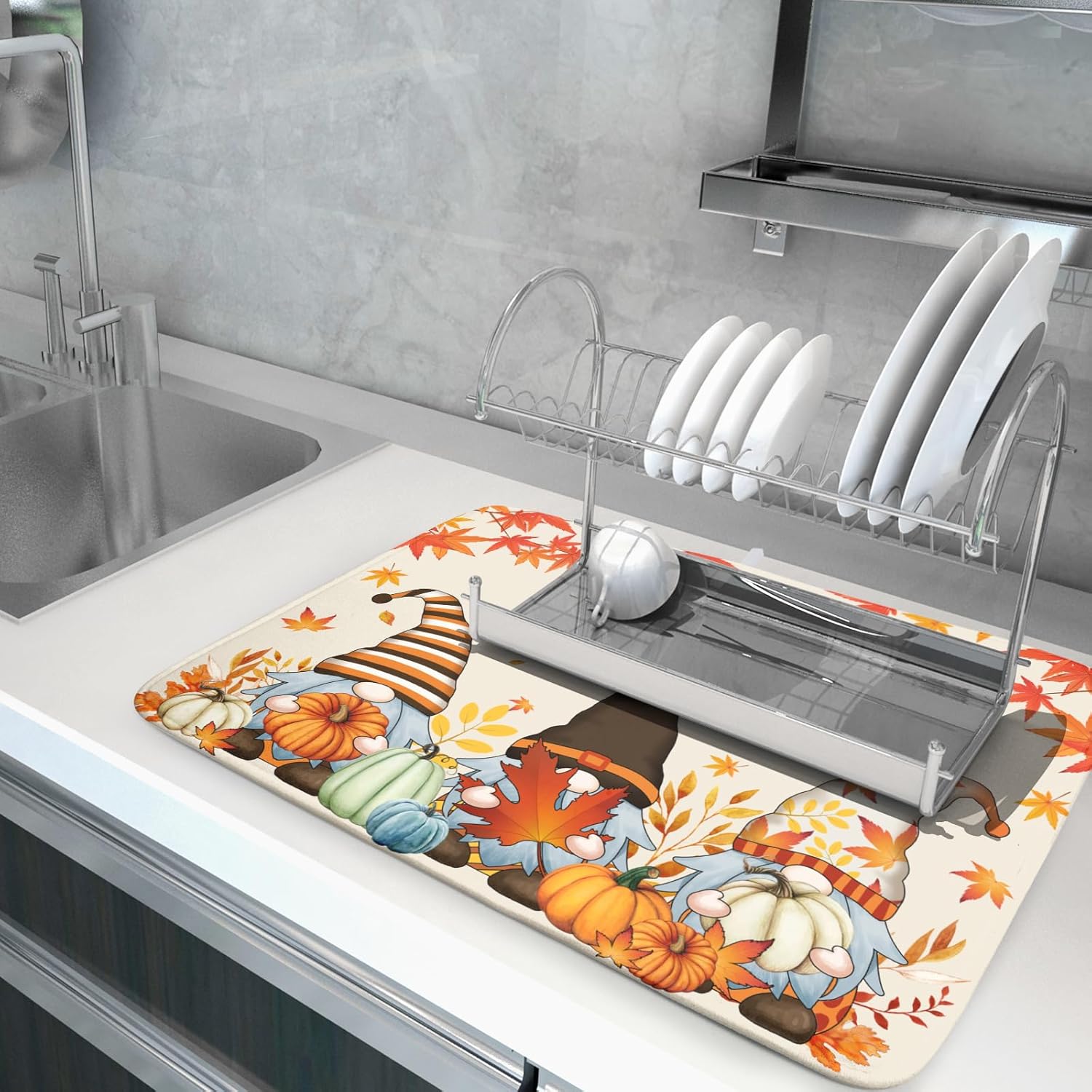 - 【Dish drying mat】The fall gnome dish drying mat is 16x18inch/18x24inch, which is suitable for most homes and kitchen countertops while providing a smart and sharp look. Our dish drying mat is soft and durable, can be used as a drying mat, put down all sizes of kitchen tableware, also can be used as a protective pad, dish mat, cup mat, heat insulation pad for countertop for heat insulation and ironing, which can perfect hold your dishes, plates, big pots and pans.