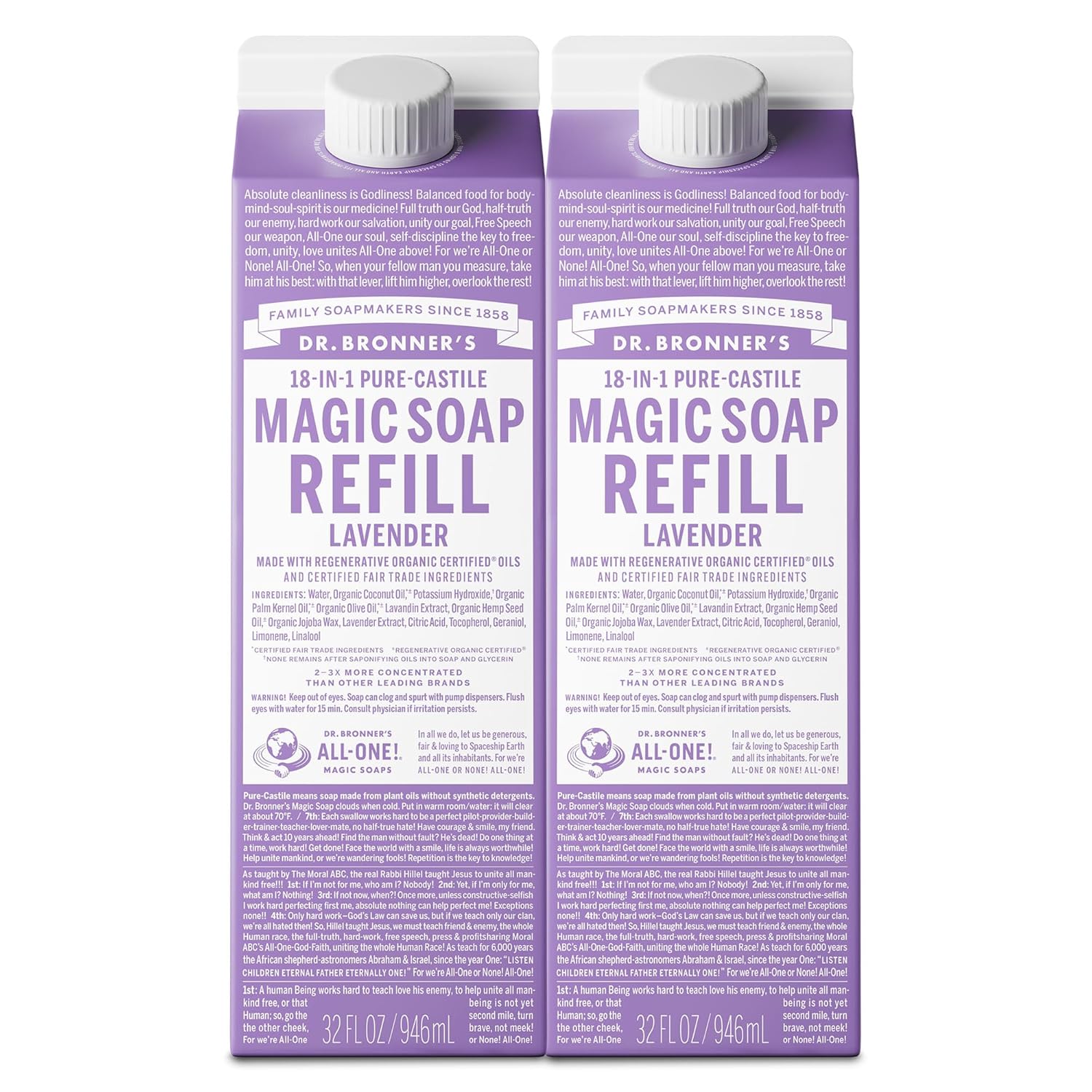 Dr. Bronner's Magic Soap-Pure-Castile Liquid Refill (Lavender, 32 ounce, 2-Pack) - Made with Regenerative Organic Certified Oils, For Body, Hair, Laundry, Pets & Dishes, Concentrated, Vegan, Non-GMO