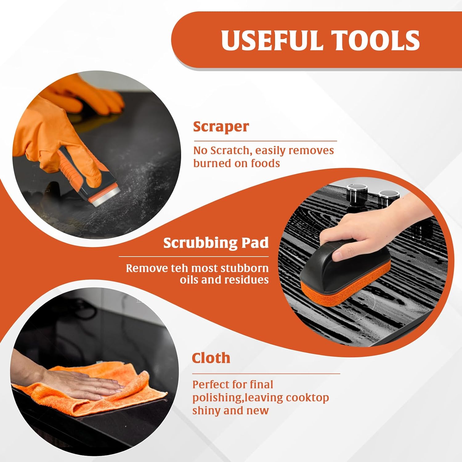 Glass Stove Top Cleaner Kit 12 oz, Cooktop Cleaner and Polish Non-Abrasive No Scratch Removes Tough Stains, with Scrubbing Pad, Handle, Scraper, Cloth