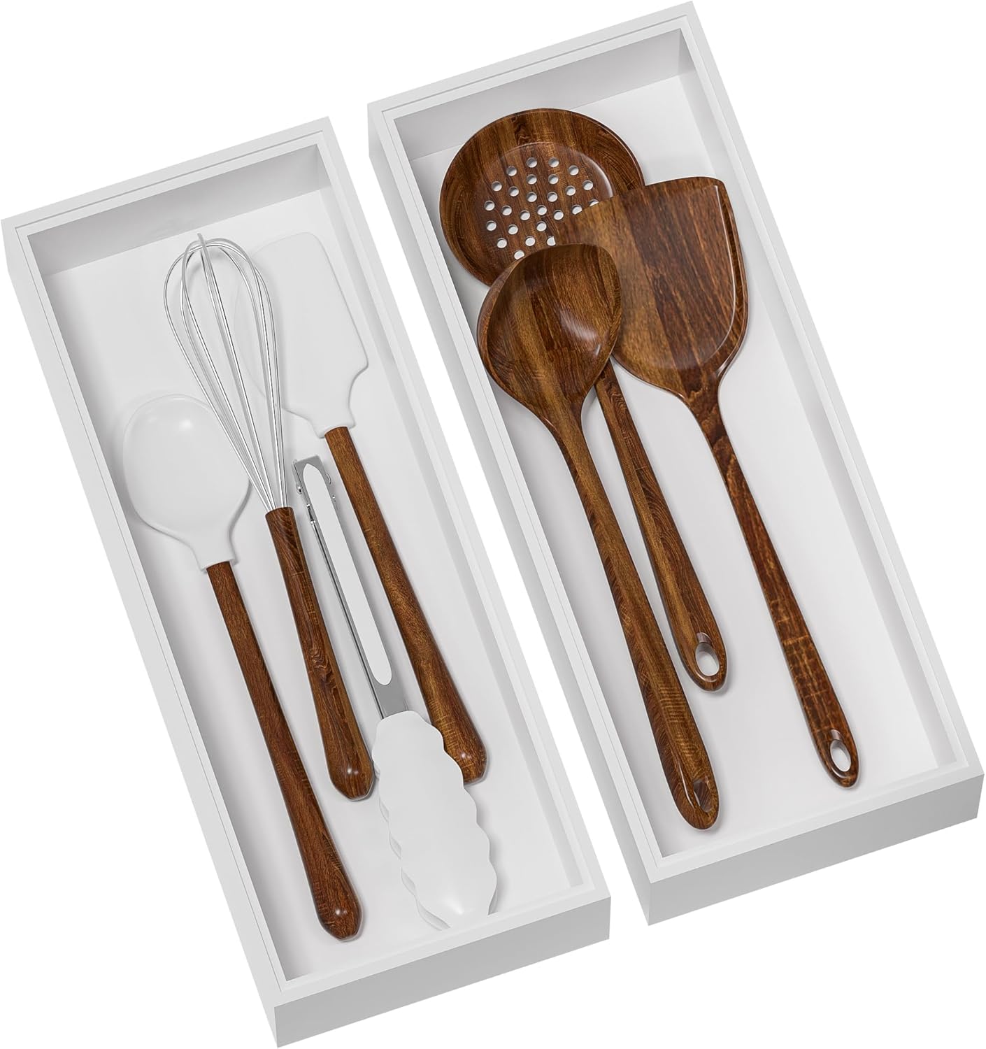 - 2 PCS Kitchen Drawer Organizer - Our kitchen drawer organizers for small or large utensils, silverware, cutlery and flatware is an absolute necessity for kitchen. This silverware organizer set offers ample space for storing most cooking utensils in the kitchen, such as spatulas, ladles, tongs, and whisks, also an great idea for organizing cutlery like spoon