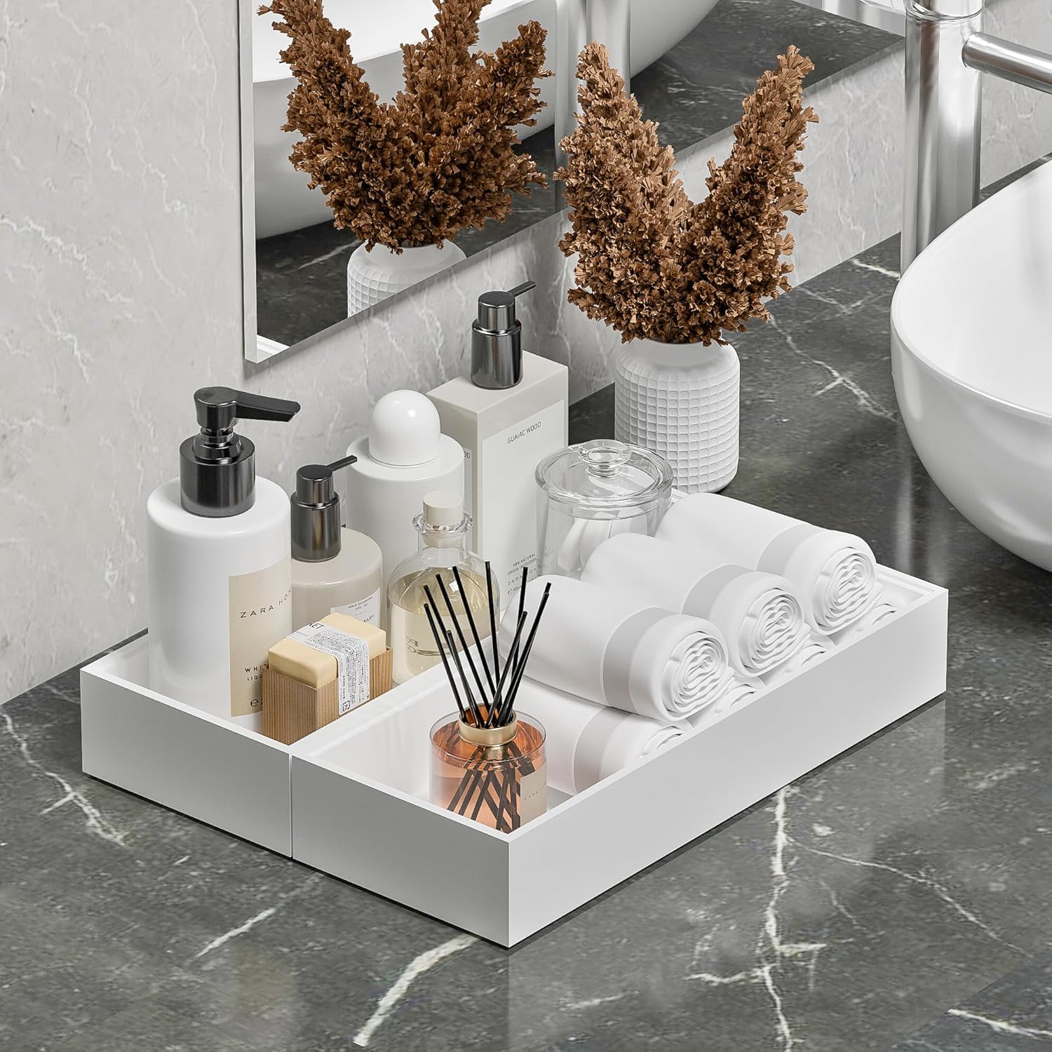 - Luxury Bathroom Trays for Counter - The toilet paper storage basket is made of bamboo, and the bottom are made from engineered wood board, which is more durable and sturdy than plastic. The bamboo boxes will creat a natural and beautiful space to your bathroom. Super ideal bathroom decor accessories