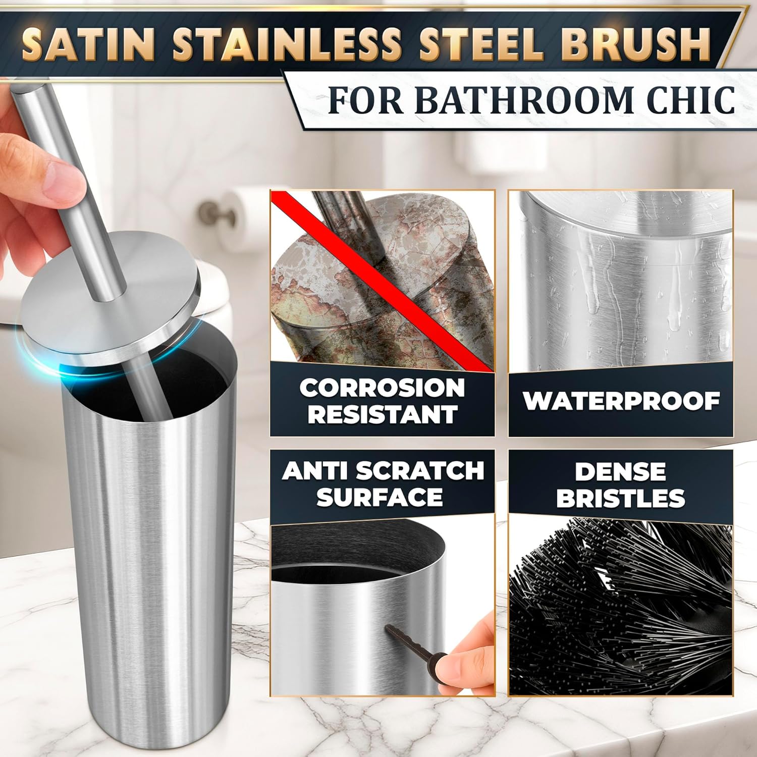Stylish Stainless Steel Toilet Brush and Holder Set - Silver Toilet Bowl Brush and Holder with Splash Cover, Sturdy Bristles, Corrosion & Scratch Resistant - Elegant Design, Effective Deep Cleaning