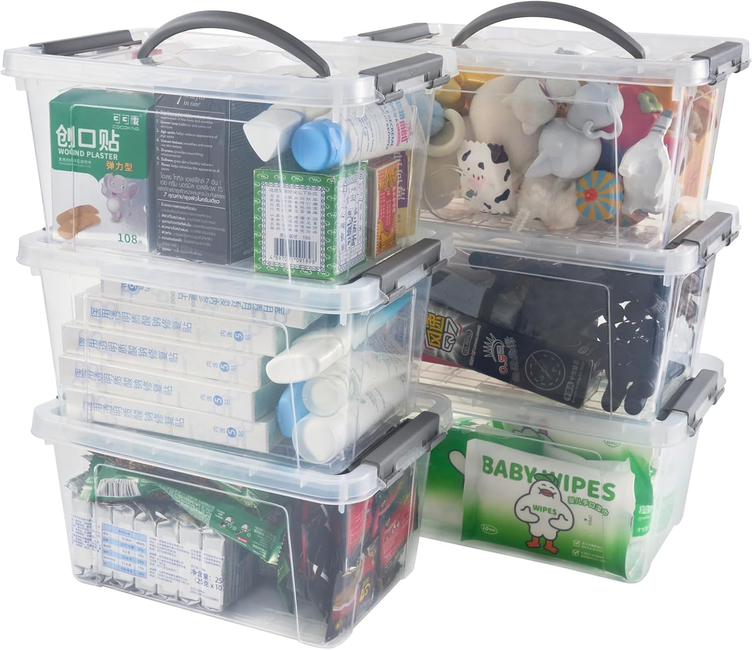 6 Quart Plastic Stackable Storage Latch Bins,Clear Latching Box with Handle and Lid,Pack of 6 (Grey Handle)