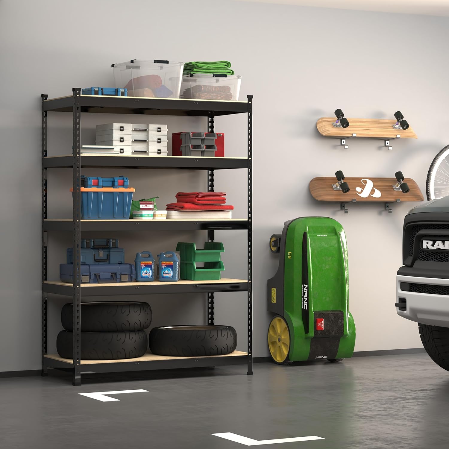 - 【Heavy Duty Garage Shelving Unit】The 5-tier garage storage shelving unit is constructed from high-quality thick MDF boards and a heavy-duty metal frame with a premium powder-coated finish surface. Each shelf layer is equipped with 2 middle support beams. It's not only sturdy and long-lasting, but also ensures the shelf maintains its appearance and performance in various environments. Each shelf holds up to 600 lbs, 5 tier shelves' total max load weight is 3000 lbs