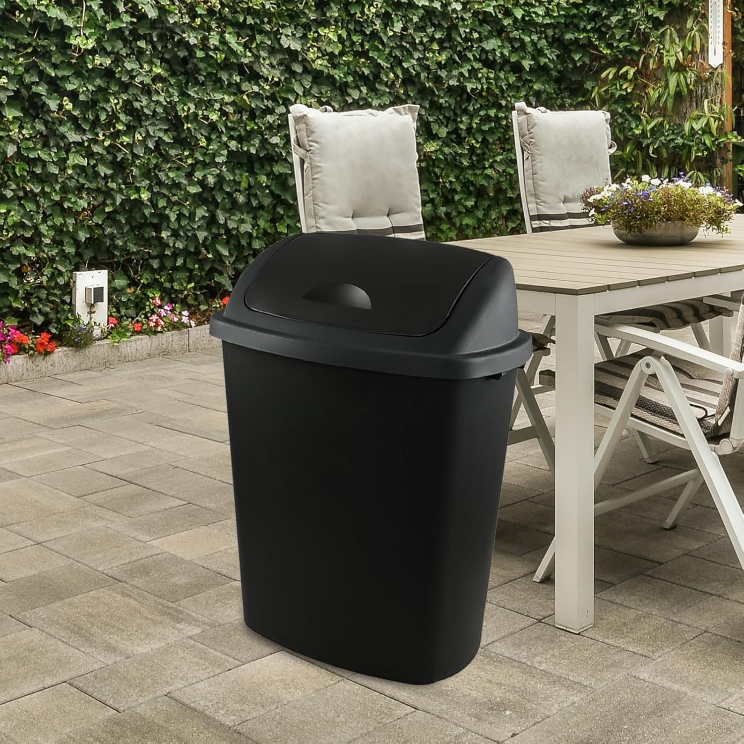 • Large plastic swing top trash can, with 18 gallon capacity, ideal for indoor or outdoor use