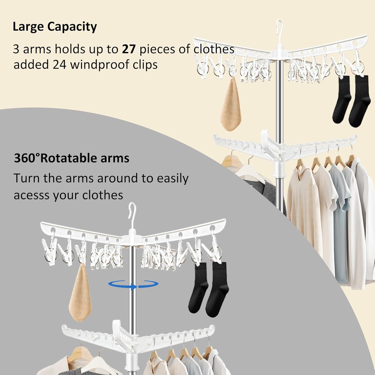 • [360-Degree Independent Rotation]Both tiers of the SUYU drying rack rotate independently, providing easy access to all your clothes. This feature simplifies the hanging and retrieval process, making it a convenient addition to any space.