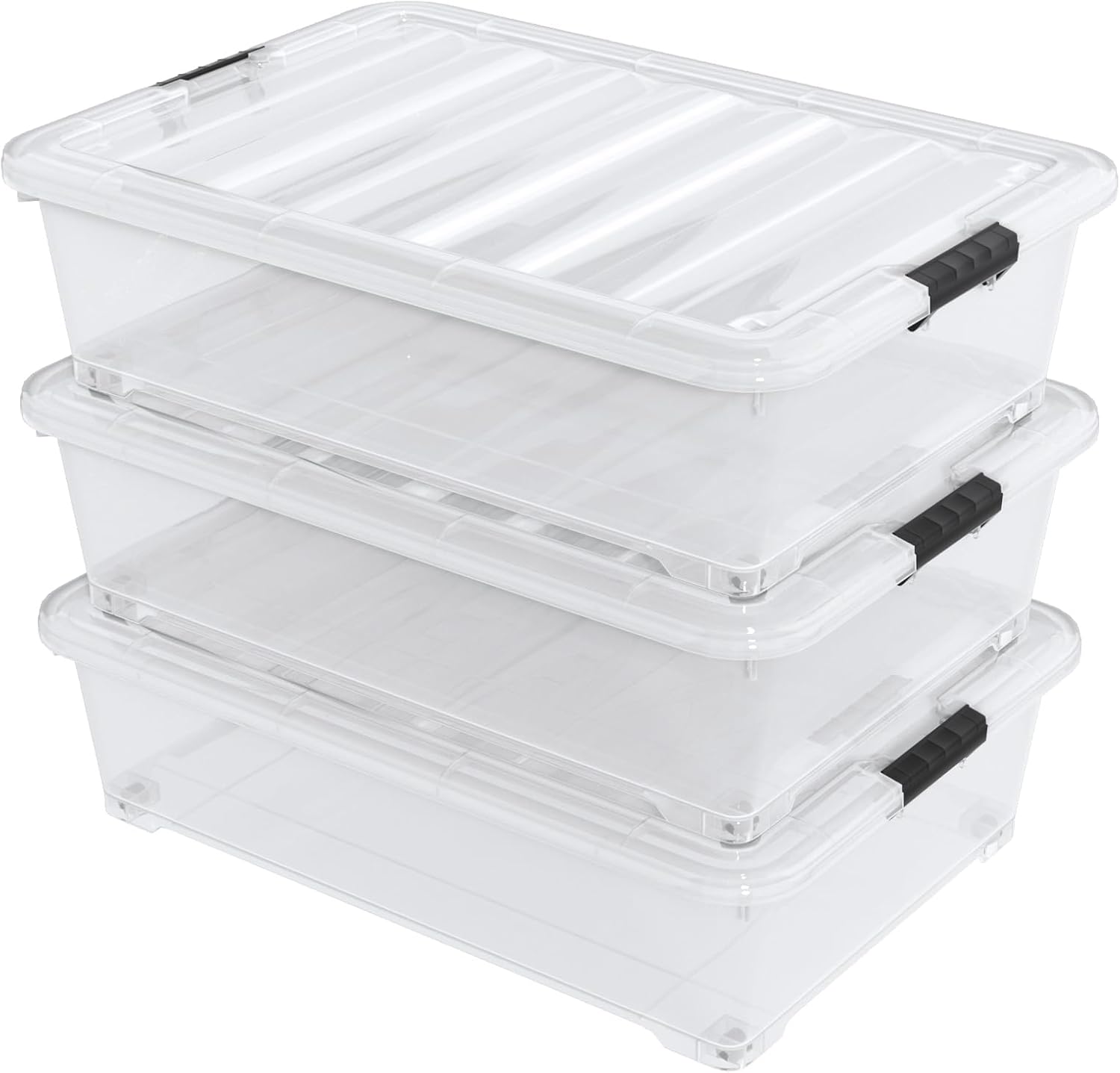 50 Quart Large Clear Plastic Under Bed Storage Bins with Wheels, 3-Pack Stackable Storage Bin with Latching Lid