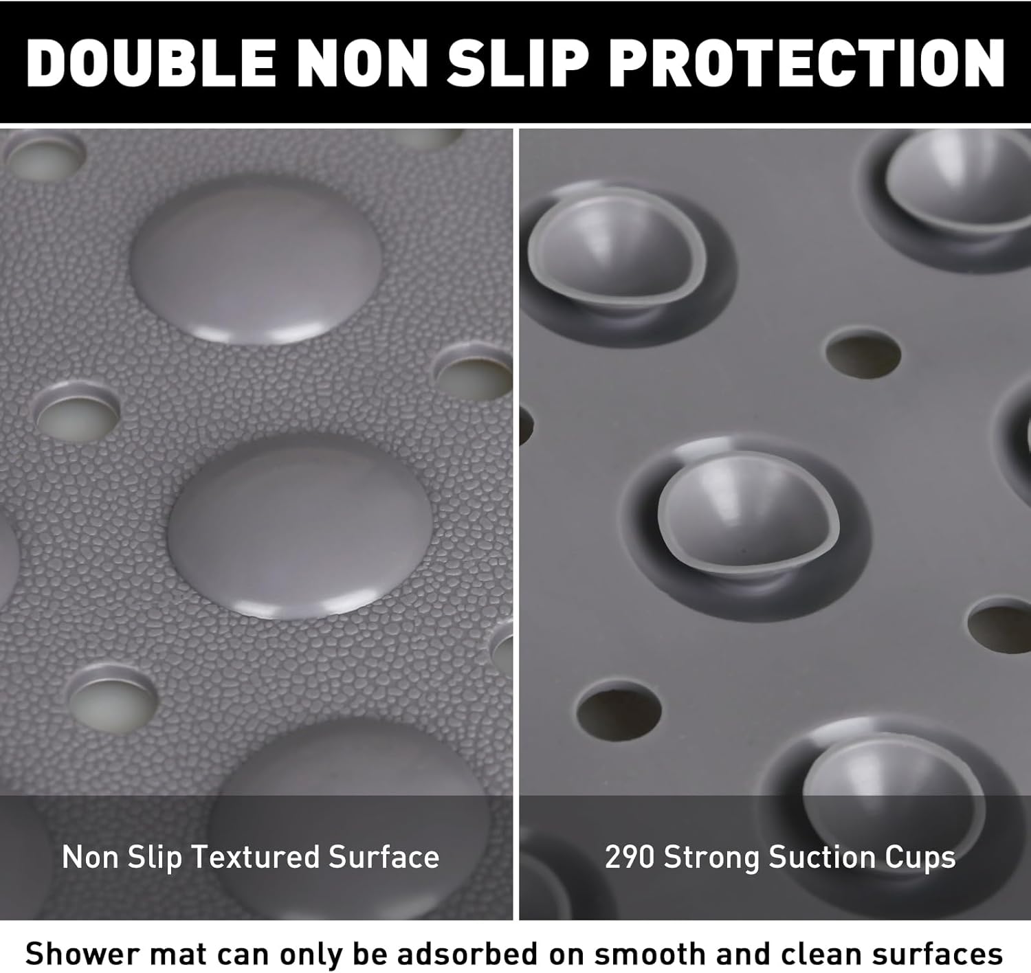 • SUPER NON SLIP: Our shower mat has a delicate anti-slip texture on the surface and 290 suction cups on the back, which can be firmly adsorbed on the floor. Note: To prevent slipping, do not use shower oils. Shower mats can only be adsorbed on smooth and clean surfaces