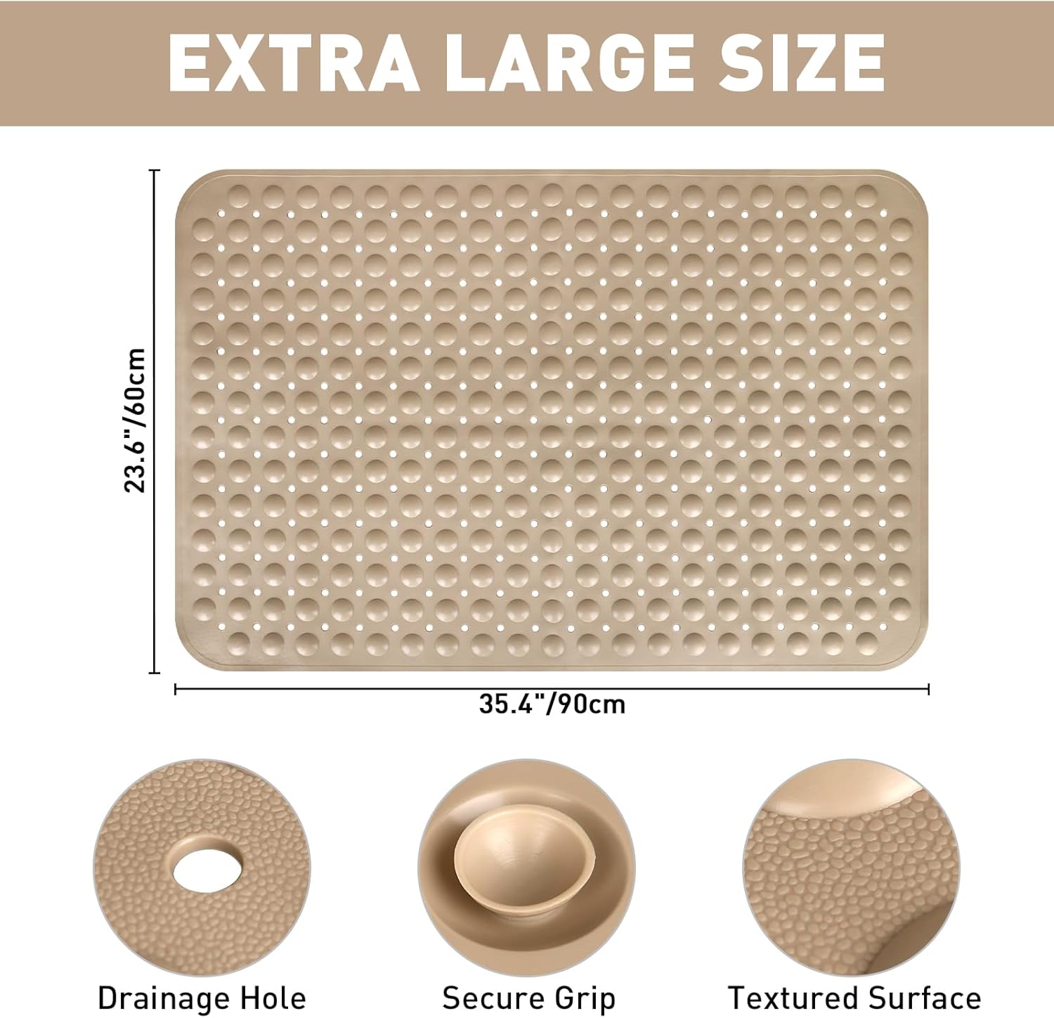 • EXTRA LARGE SIZE: The size of the shower mats for inside is 35.4 x 23.6 inch, which is very suitable for large stand up or walk in showers. It is heavier and thicker than other anti slip shower mat and is perfect for elderly, pregnant woman, gym, spa and commercial