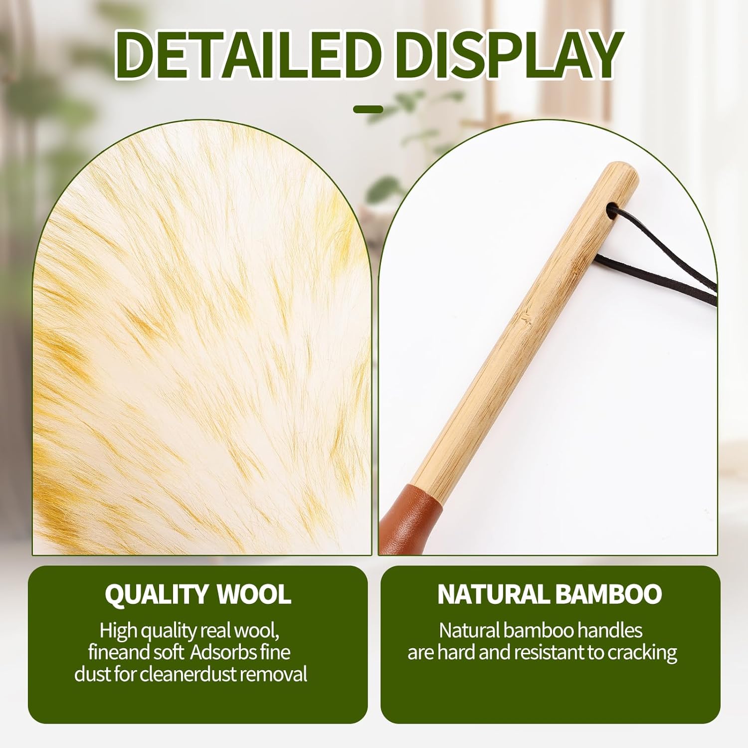 • Handle Design: Features a lightweight, 7-inch (18cm) sustainably sourced wooden handle, comfortably cleaning desktops, pianos, shelves, antiques, car interiors, electronic equipment dust, plants, on picture frames, and other places