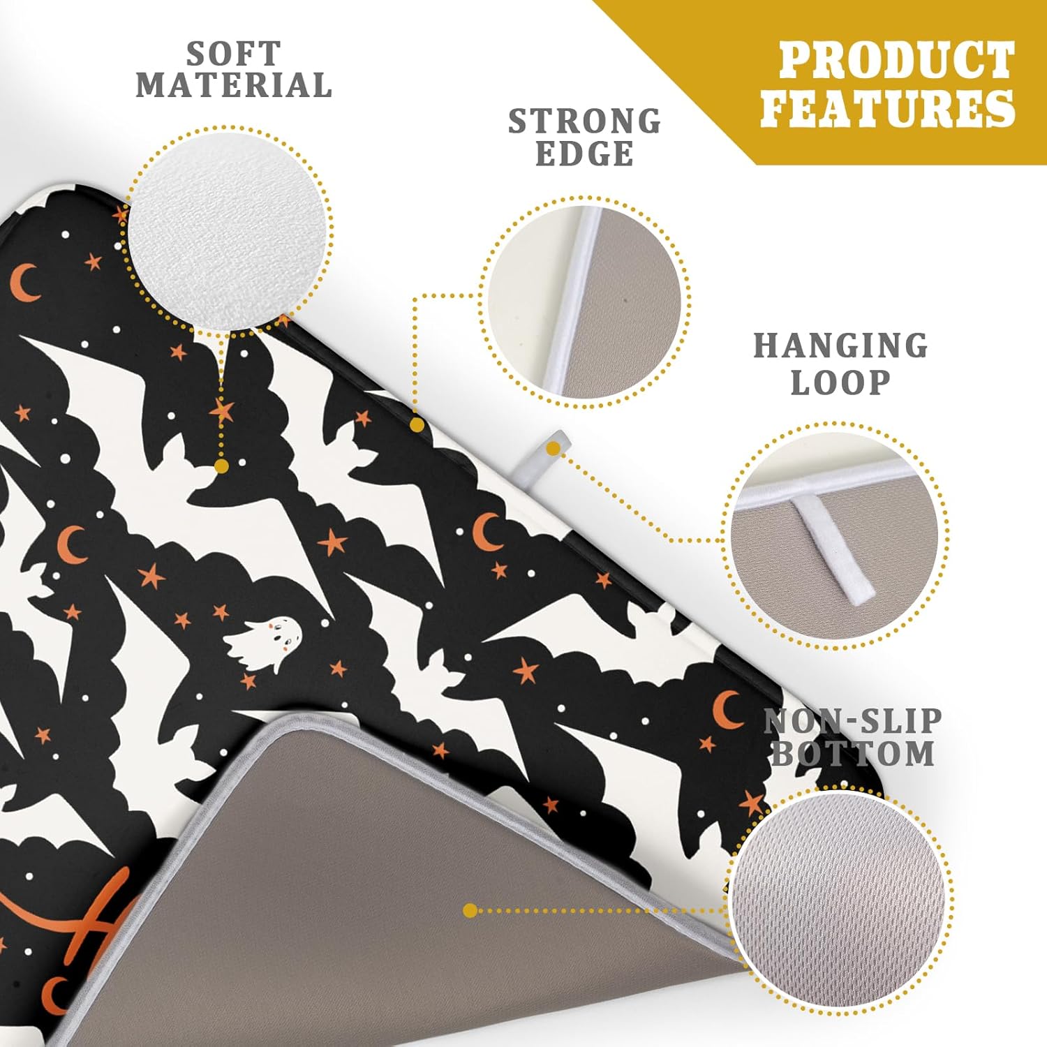 - 【Dish drying mat】The halloween kitchen mat is 16x18inch/18x24inch, which is suitable for most homes and kitchen countertops while providing a smart and sharp look. Our dish drying mat is soft and durable, can be used as a drying mat, put down all sizes of kitchen tableware, also can be used as a protective pad, dish mat, cup mat, heat insulation pad for countertop for heat insulation and ironing, which can perfect hold your dishes, plates, big pots and pans.