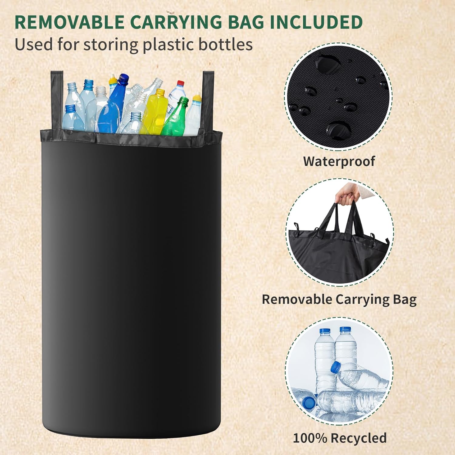 • REMOVABLE INNER CARRYING BAG - Recycling bin with lid has a waterproof inner bag that is securely fastened with high-quality horn clips to prevent the bag from falling or slipping. The carrier bag can be removed to take the deposit bottles with you