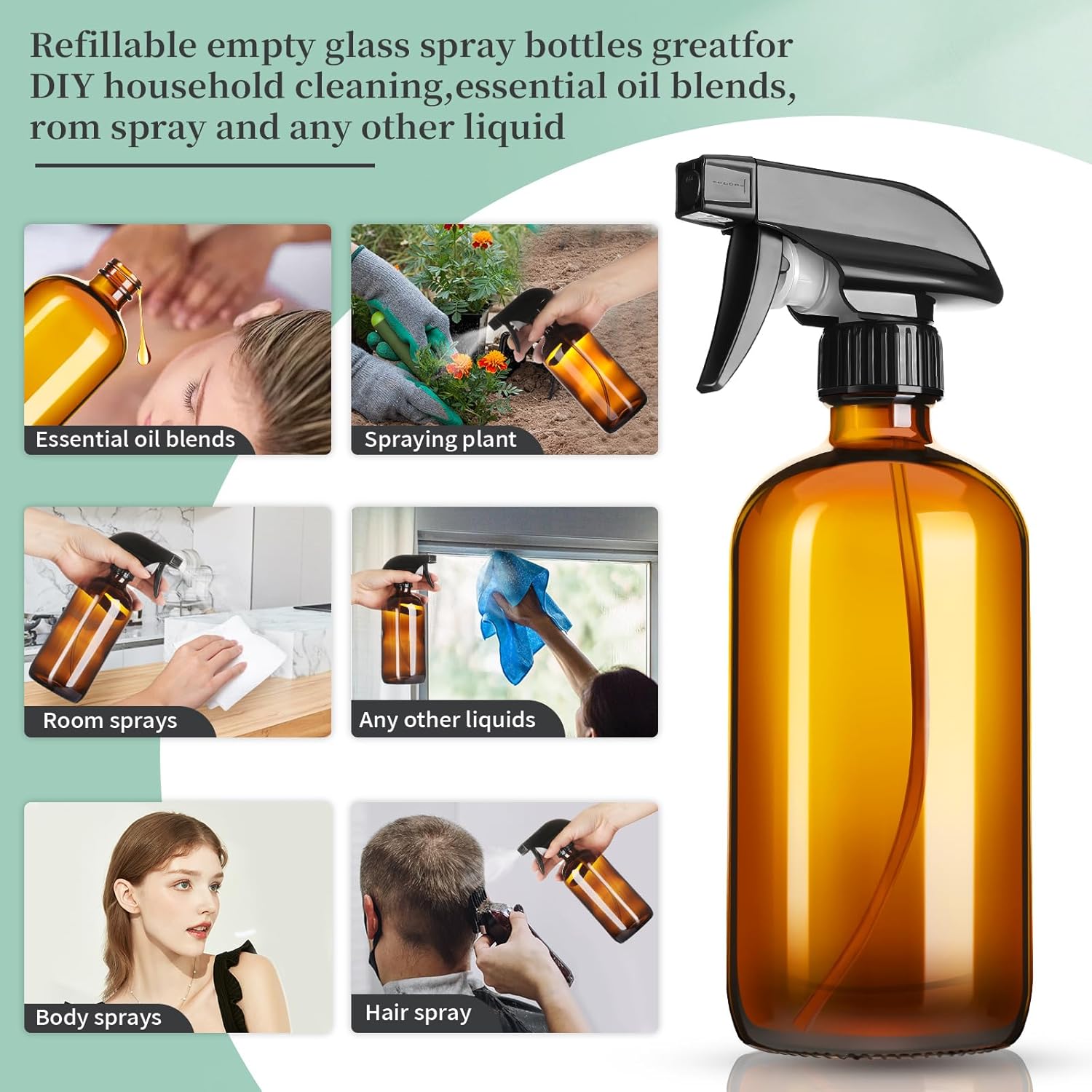 16oz Amber Glass Spray Bottles,4 Pack Glass Spray Bottles Refillable Empty Bottle with Adjustable Nozzle,Spray Bottle for Cleaning,Essential Oils,Cleaning,Pets,Plant, Hair Mister