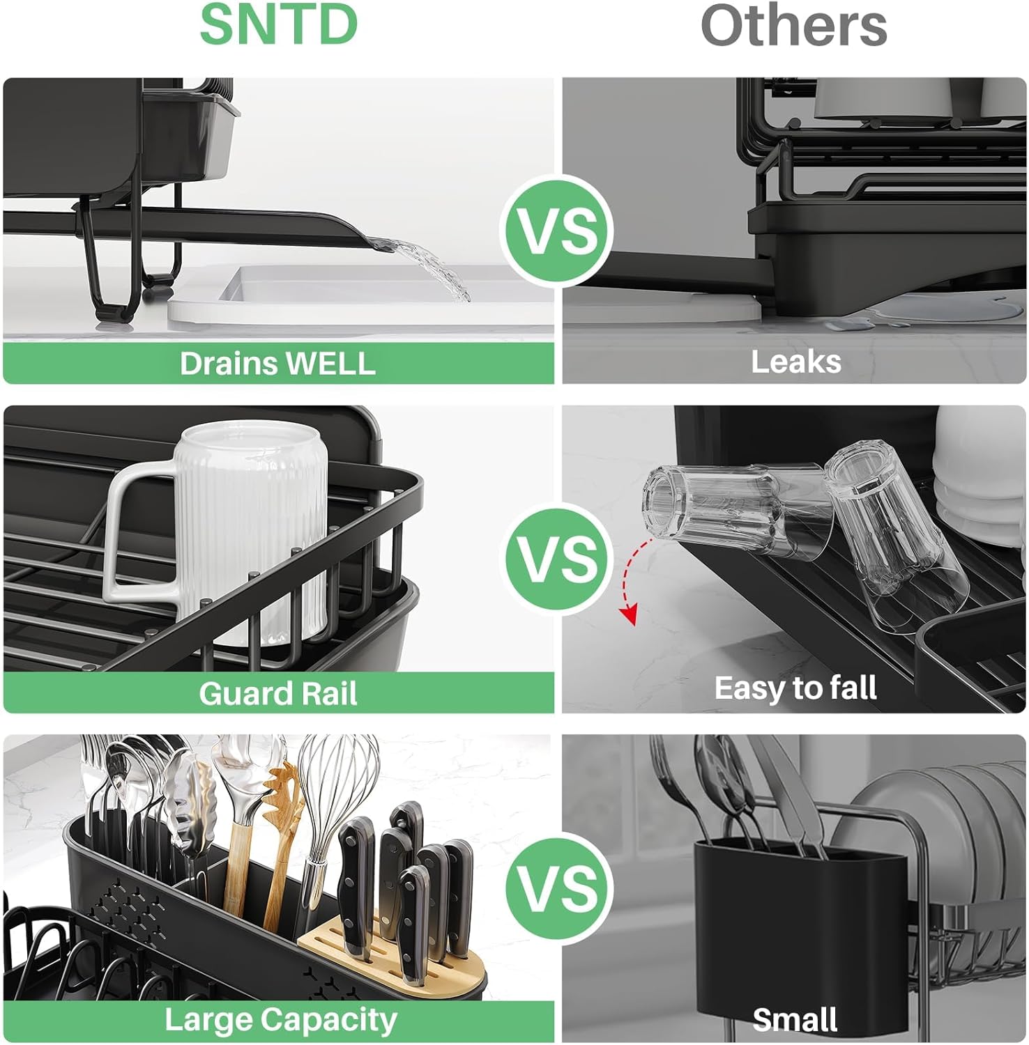 • Fast Drainage: Our dish rack features an angled drainboard that efficiently drains excess water directly into the sink. This design prevents puddles on your countertop and reduces drying time.