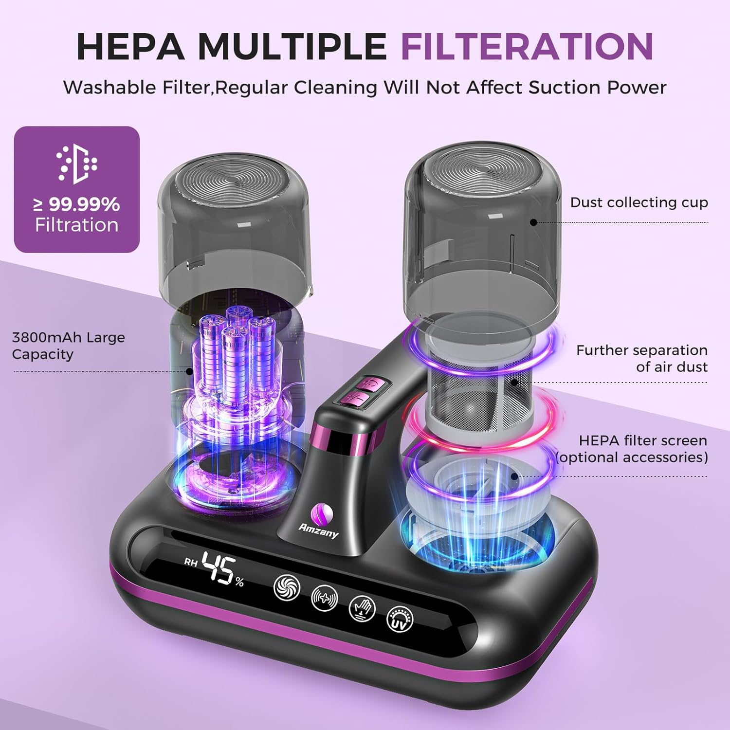 • 【EFFICIENT CLEANING PERFORMANCE】Amzany The most powerful vacuum cleaner up to 16Kpa suction, 200W stable power, easy to pick up fine dust deep in the mattress quickly.