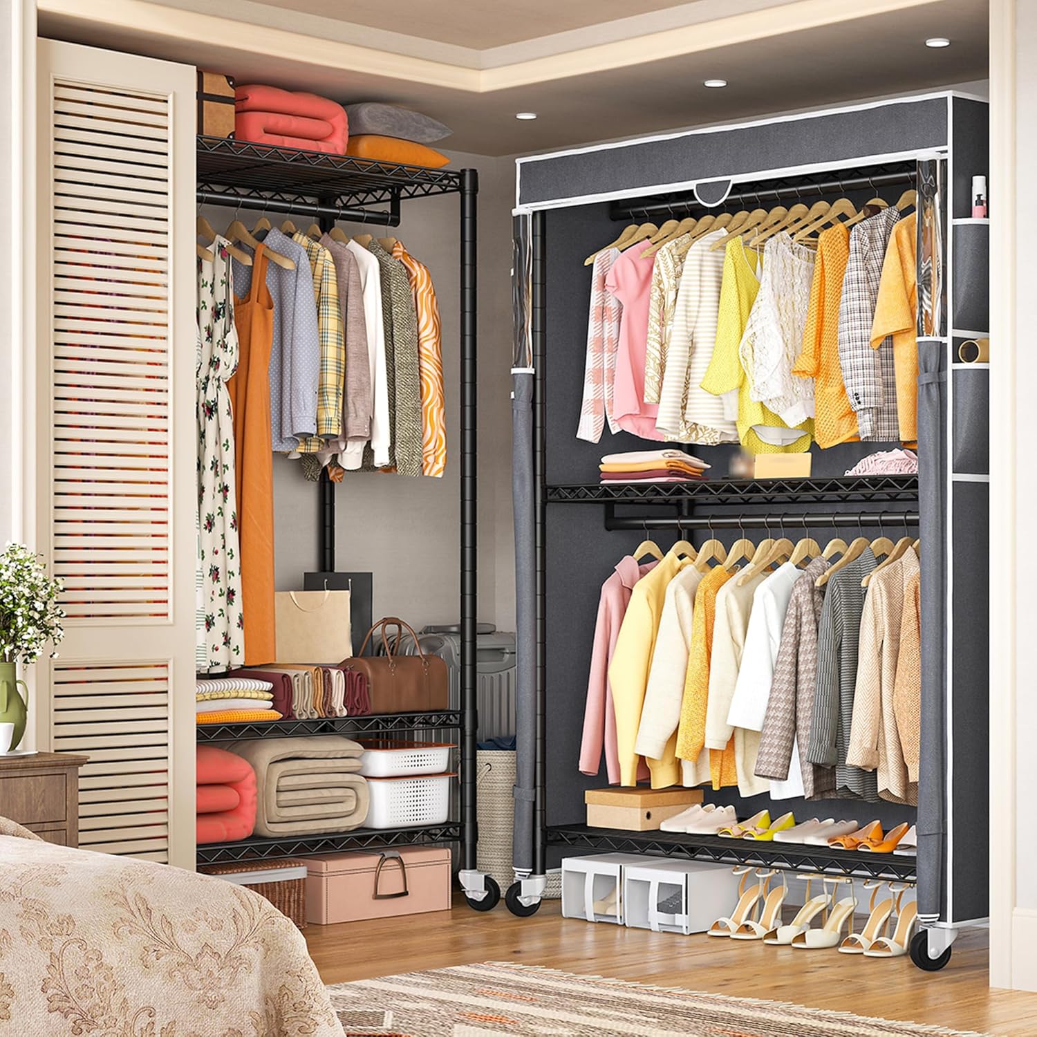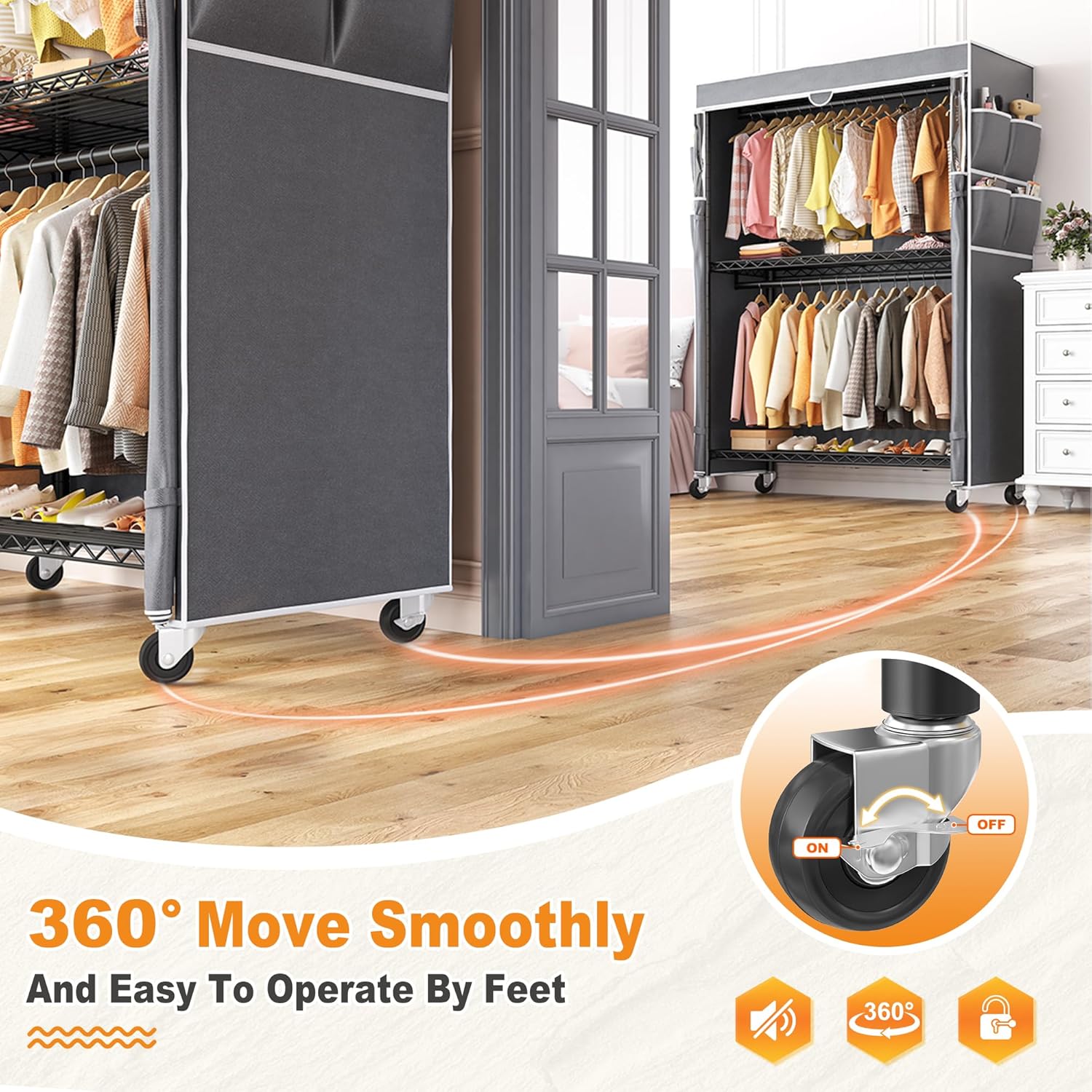 - 【Quality Clothing Rack can be Used in Multiple Situation】: The clothes racks are equipped with a window dust cover and two options for supporting feet. When moving this garment rack, you can choose 360° rotating wheels, designed to allow you to roll this garment rack anywhere you need in your home, and two of the wheels are lockable, so you don't have to worry about the clothes rack will run on its own. You can also use adjustable feet to support the clothes rack to meet your various use needs.Stay organized and efficient—great for school, dorm, or home workspace