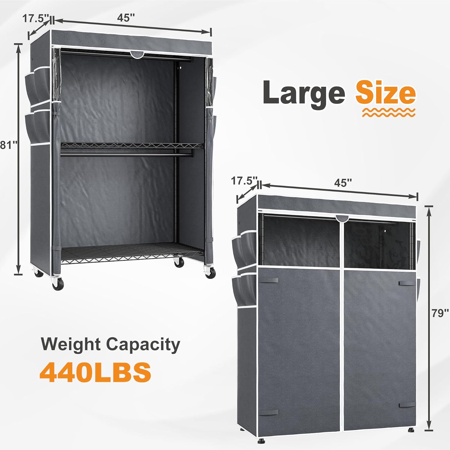 Raybee Clothes Rack with Cover, 81" H Clothing Racks for Hanging Clothes, Portable with Wheels and Adjustable Feets, Max Load 440LBS, Black
