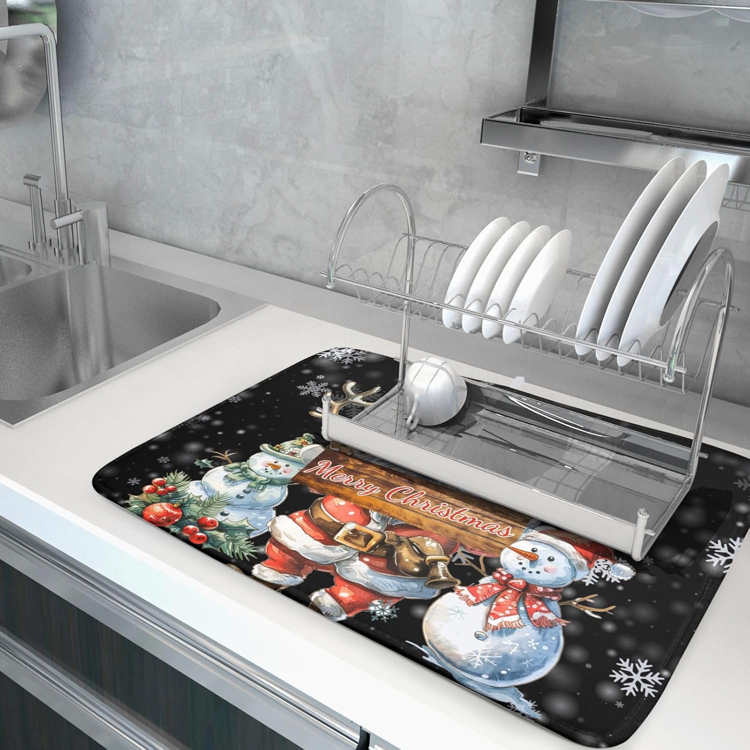 - 【Premium Material】The christmas kitchen dish drying mat is made of high-quality polyester surface material, and the middle is composite sponge material, provides a soft protective cushion. The backing with reversible superfine fiber can absorb water several times heavier than itself, which quickly absorbs water, stops liquids from soaking through, keep the kitchen countertop dry and clean. The dish drying mat can been double-sided uses with strong edging, not easy to disperse.