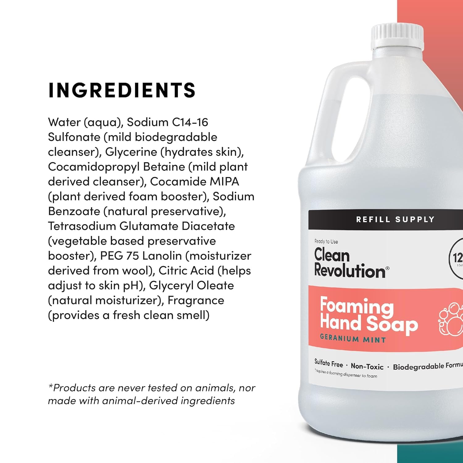 • REFILL & REUSE: Our Refill Supply container delivers exceptional value with 128 ounces of ready to use liquid foam soap designed to be used with Clean Revolution Refillable Foaming Hand Soap dispenser. This gallon jug has more than 8 refills, eliminating the need for individual single-use bottles and creating less plastic waste. Foaming Hand Soap dispenser sold separately.