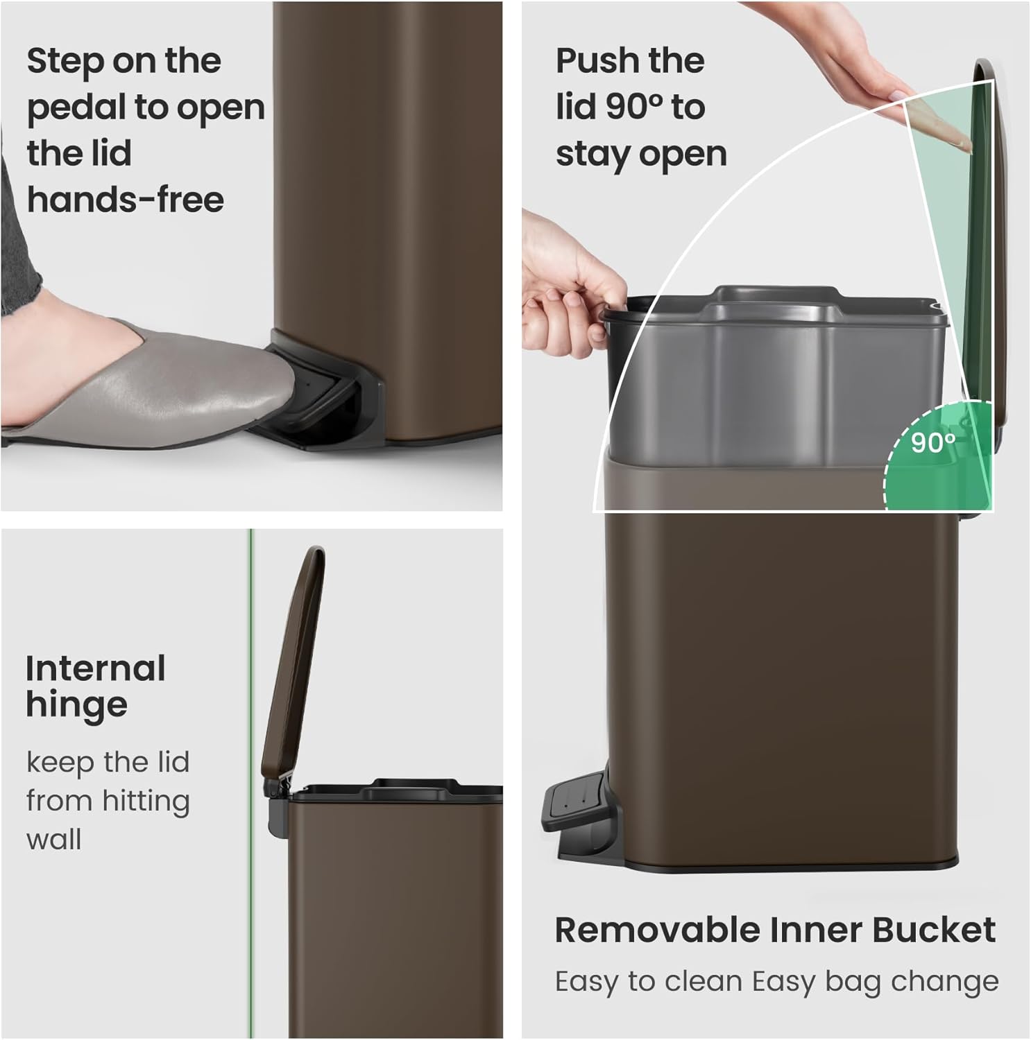 Cesun Small Bathroom Trash Can with Lid Soft Close, Step Pedal, 6 Liter / 1.6 Gallon Stainless Steel Garbage Can with Removable Inner Bucket, Anti-Fingerprint Finish (Brown)