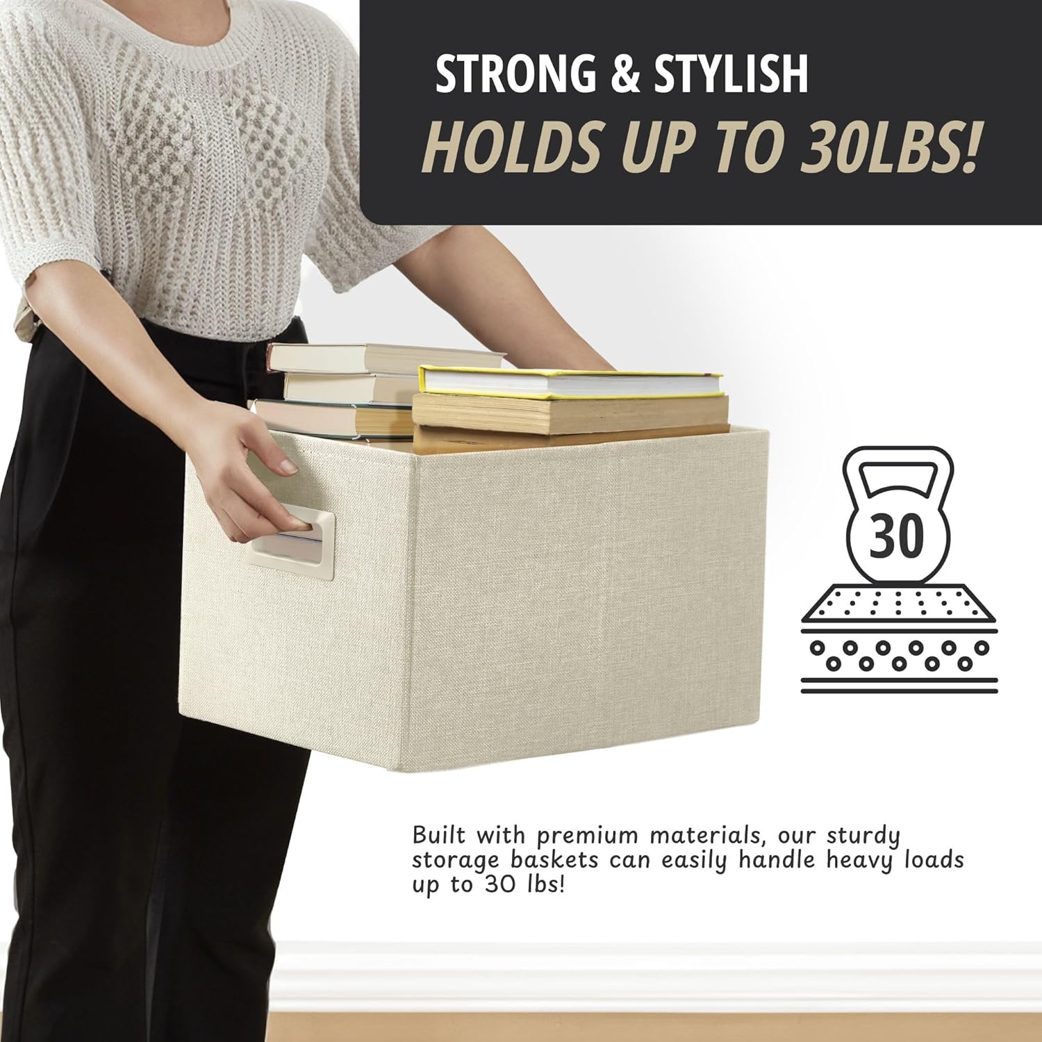 • Elegant Design: Crafted with a beautiful faux linen exterior and sleek cut-out handles for a clean, modern look. Stylish and practical large storage baskets for any home décor.