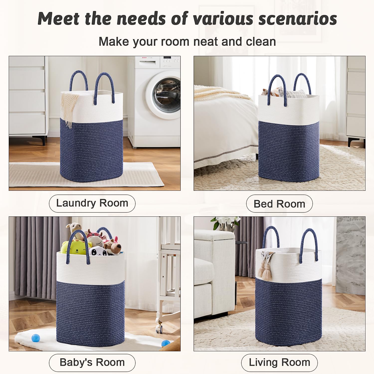 Laundry Basket,Woven Cotton Rope Laundry Hamper,Versatile Storage for Dirty Clothes,Baby Toys,and Blankets in Bathroom, Nursery,and Living Room (Blue, 40L)