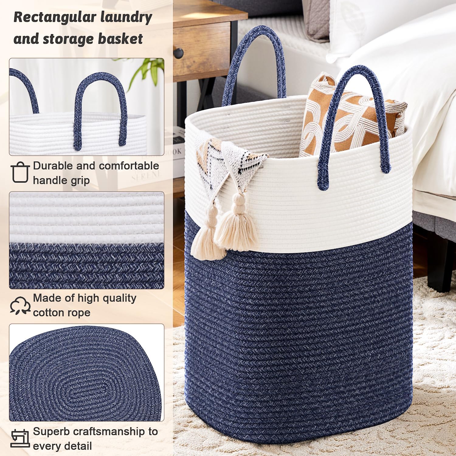 Laundry Basket,Woven Cotton Rope Laundry Hamper,Versatile Storage for Dirty Clothes,Baby Toys,and Blankets in Bathroom, Nursery,and Living Room (Blue, 80L)